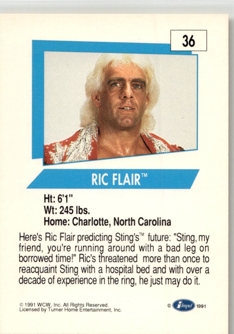 | Description: | Ric Flair | | Category: | Wrestling | | Year: | 1991 | | Product: | Impel WCW | | Card Number: | 36 | | Dimensions: | 3¾" x 2½" | | SKU: | WR B0002 R02 C (47) |
