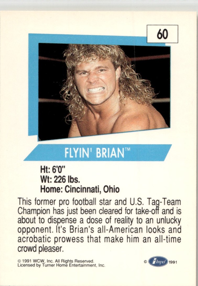 | Description: | Flyin' Brian | | Category: | Wrestling | | Year: | 1991 | | Product: | Impel WCW | | Card Number: | 60 | | Dimensions: | 3¾" x 2½" | | SKU: | WR B0002 R02 C (40) |