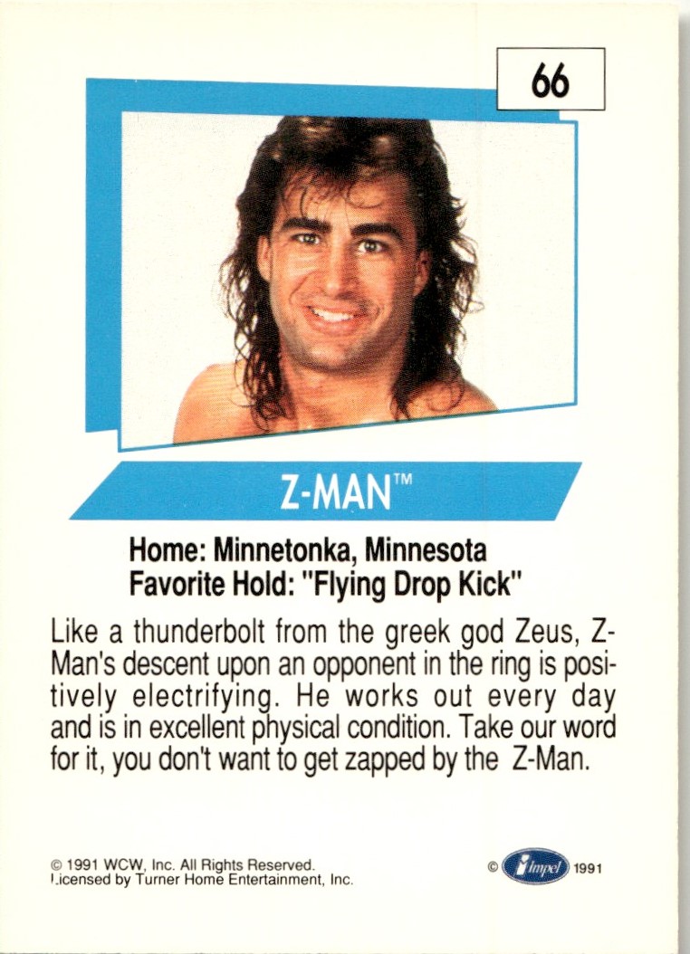 | Description: | Z-Man | | Category: | Wrestling | | Year: | 1991 | | Product: | Impel WCW | | Card Number: | 66 | | Dimensions: | 3½" x 2½" | | SKU: | WR B0004 R01 E (35) |