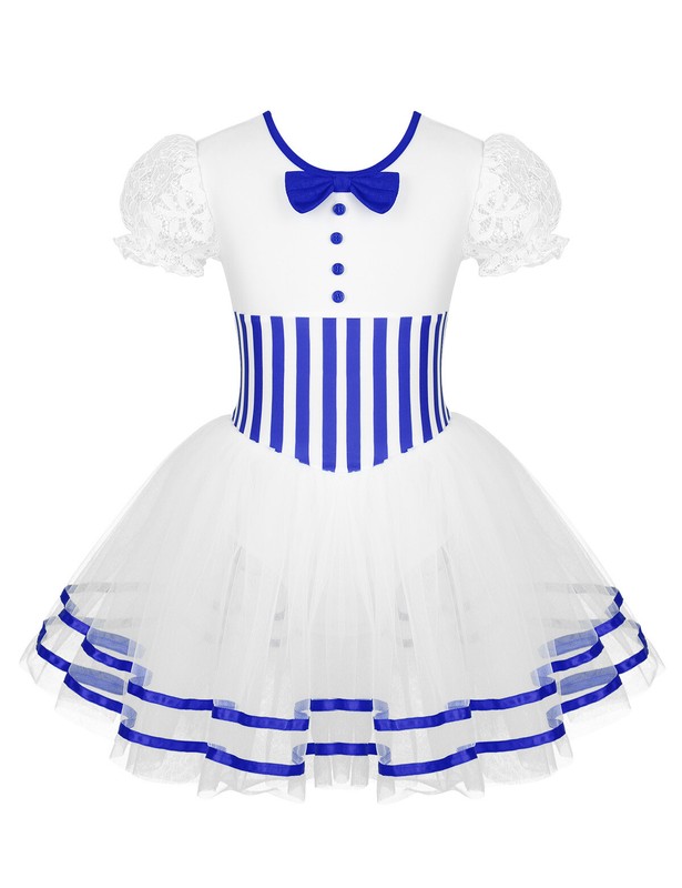 Short puff lace sleeves, round neckline with bow, top bodice front with decorative buttons. Striped waist design.