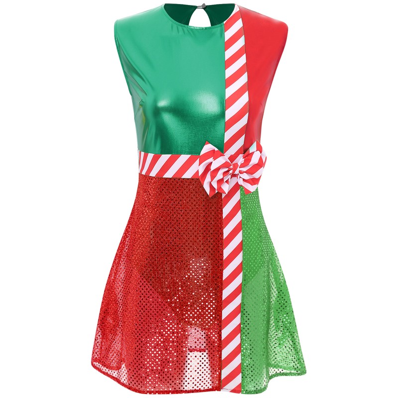 Metallic shiny cloth and sequined mesh bring shiny effect, dressing up you as a lovely Christmas elf or Mrs. Santa Claus to the party.