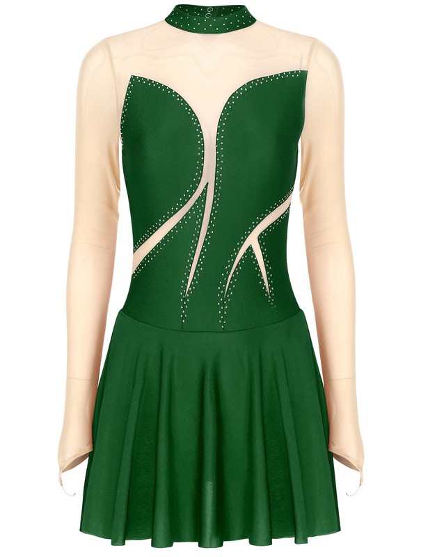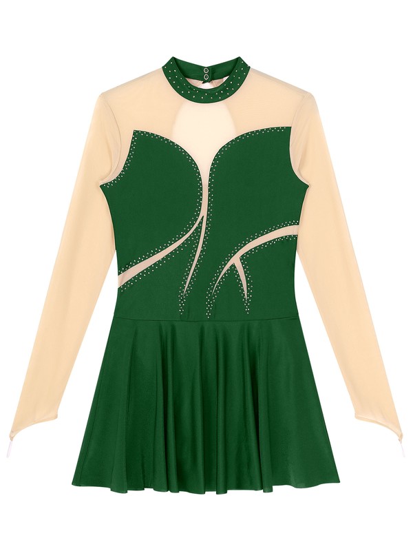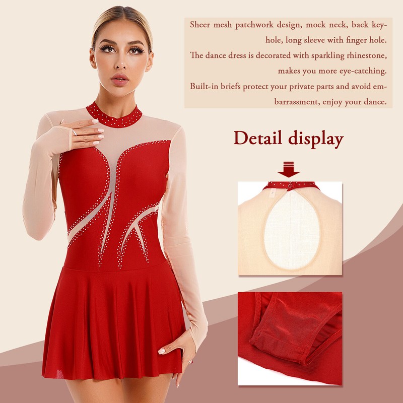 Color block dance dress, sheer mesh long sleeve with finger hole, rhinestone detail.