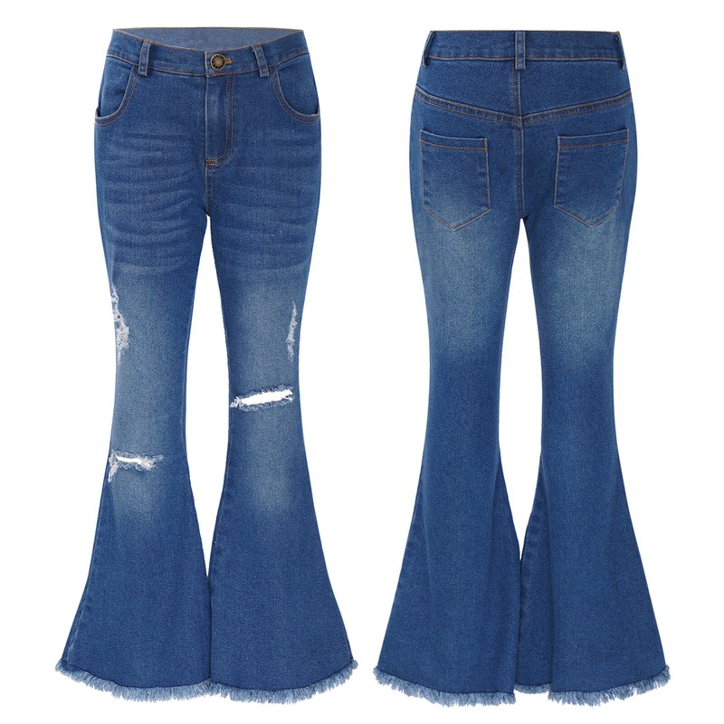 The pants with one button and zipper closure crotch, fashion denim ripped style, tassel hem, bell-bottom style.