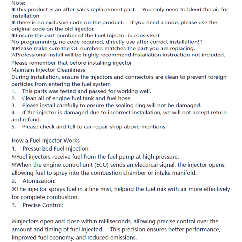 Note: Maintain Injector Cleanliness: During installation, ensure the injectors and connectors are clean to prevent foreign particles from entering the fuel system ※This product is an after-sales replacement part. You only need to bleed the air for installation. ※There is no exclusive code on the product. If you need a code, please use the original code on the old injector. ※Ensure the part number of the Fuel Injector is consistent No programming, no code required, directly use after correct installation!!! ※Please make sure the OE numbers matches the part you are replacing. ※Professional install will be highly recommend Installation instruction not included.