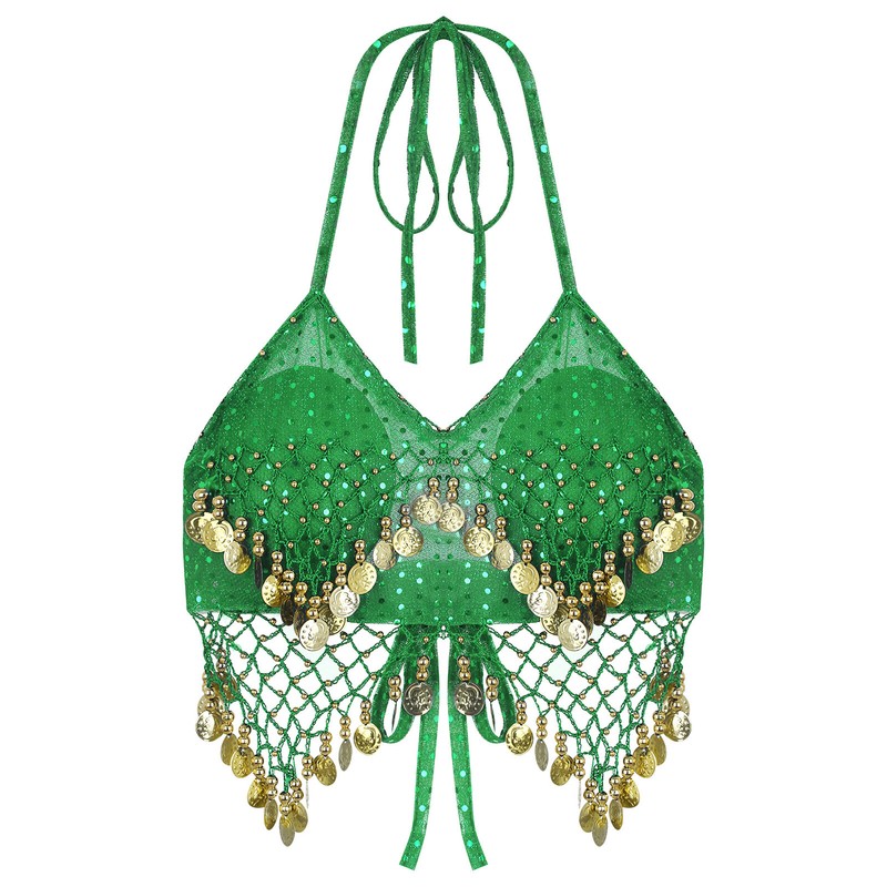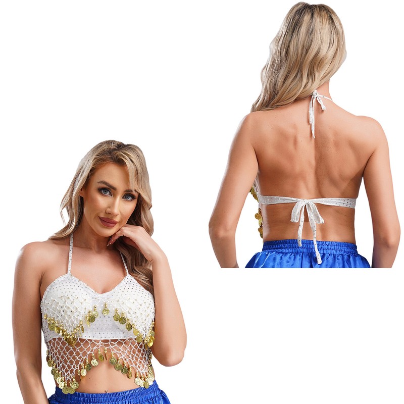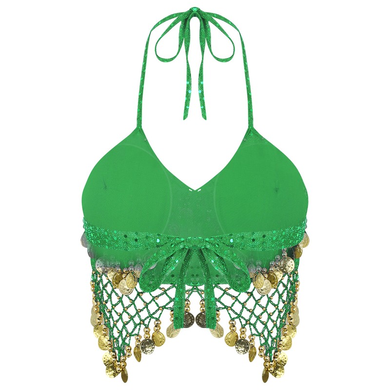 Womens Belly Dance Halter Bra Top Sequin Tassel Lace-up Dance Crop Top Costume