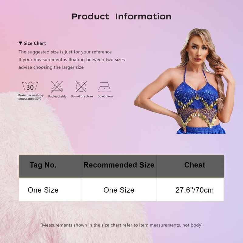 Suitable for Halloween, stage costumes, belly dance party and competitions, Samba, Cha-cha, Spanish dance, nightclub, music party and so on. Size Chart