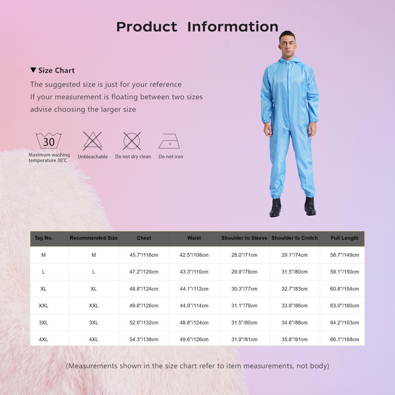 Suitable for workers of workshop, construction and maintenance, and spray paint, also for Halloween, cosplay, stage costumes and more. Size Chart
