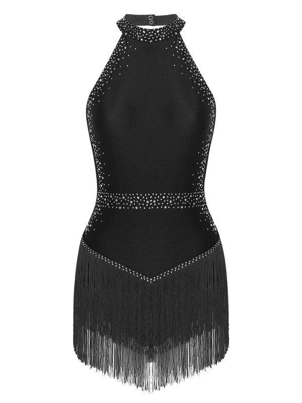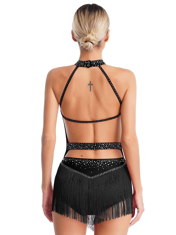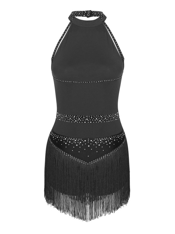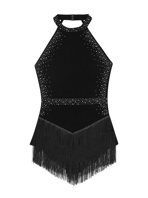 Halter sleeveless leotard tassel with rhinestones that sparkle under the light to brighten up any performance, making you more charming.