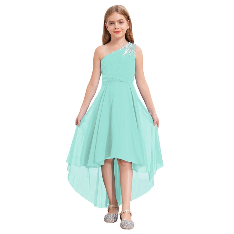 Girls Shiny Beaded Dress High-low Hem Collarless One Shoulder Dress for Evening