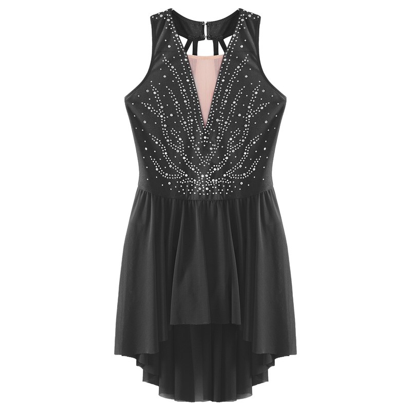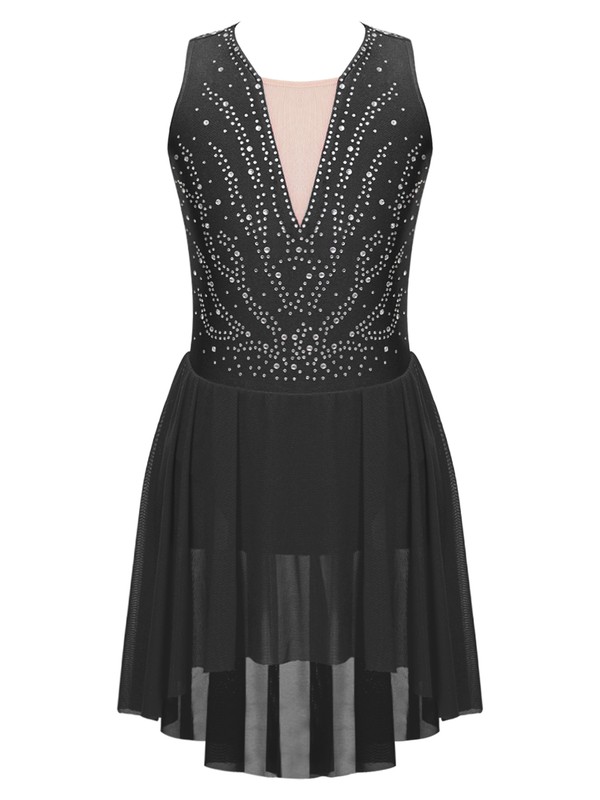 The girl’s sleeveless dance dress is embellished with rhinestones, sparkling under the light to brighten up any performance.