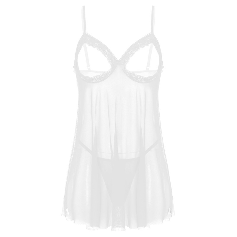 Womens Sheer Mesh Lingerie Set Lace Trim Open Cup Babydolls Dress with G-string.