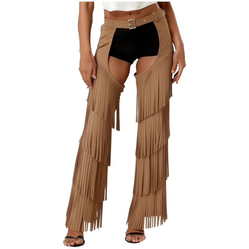 Women Western Cowgirls Chaps Tiered Tassel Hollow Out Open Crotch Pants Cosplay