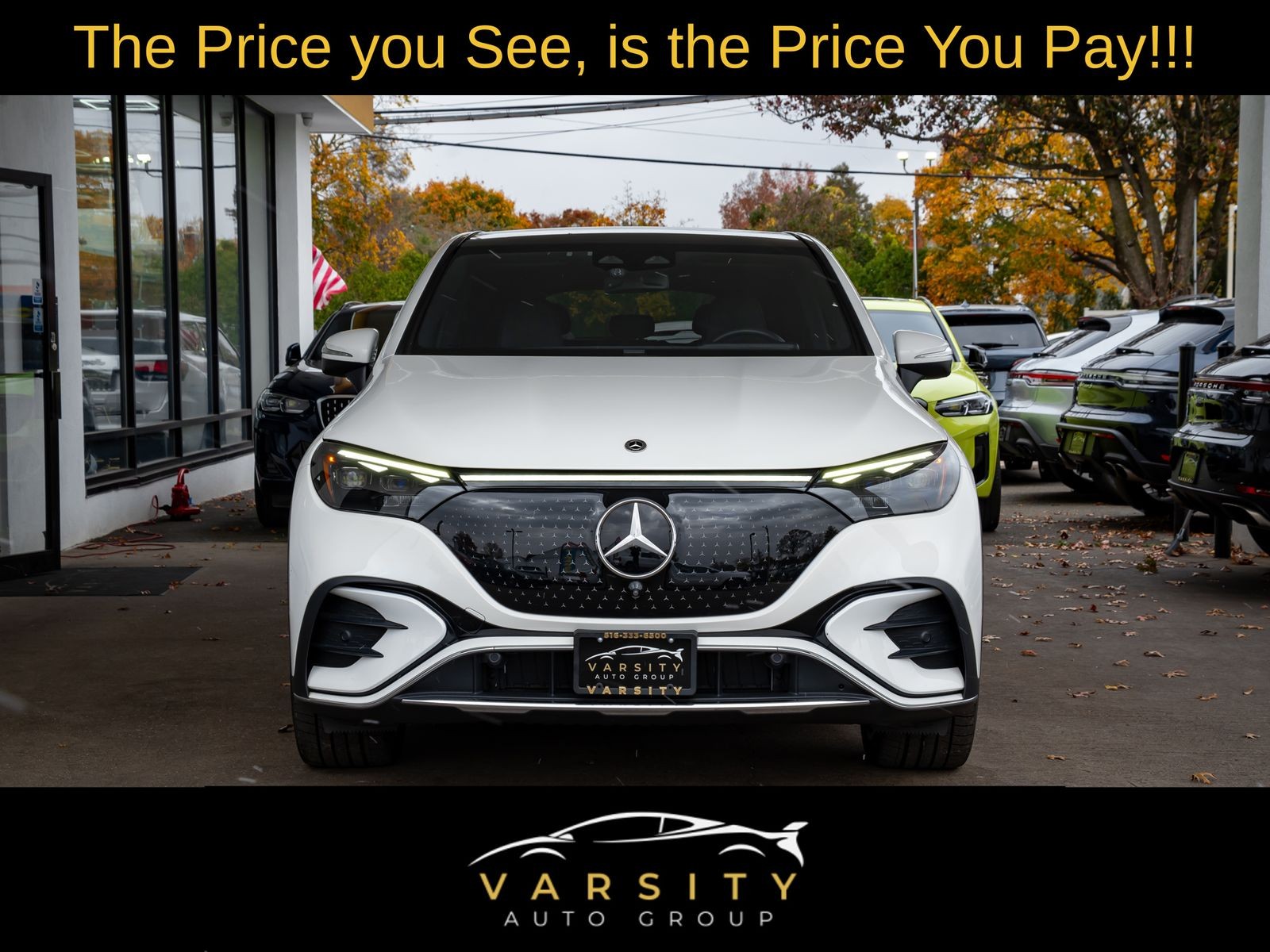 The Price you See, is the Price You Pay!!!, Mercedes-Benz EQE 350 SUV 4MATIC, Polar White, 100W USB-C Package, 110V Home Charging Cable, 15 Speakers, 4-Wheel Disc Brakes, ABS brakes, Active Ambient Lighting, Active Blind Spot Assist, Active Distance Assist DISTRONIC, Active Speed Limit Assist, Active Steering Assist, Air Conditioning, AIR-BALANCE Package, Alloy wheels, AMG Line Body Styling, AMG Line Exterior Package, Animation Projection Feature, Apple CarPlay/Android Auto, Auto High-beam Headlights, Auto tilt-away steering wheel, Auto-dimming door mirrors, Auto-dimming Rear-View mirror, Automatic temperature control, Axle Ratio: TBD, Black Headliner, Brake assist, Bumpers: body-color, Burmester Sound System, Compass, Delay-off headlights, DIGITAL LIGHT LED Headlamp System, DIGITAL LIGHT Package, Driver Assistance Package, Driver door bin, Driver vanity mirror, Dual front impact airbags, Dual front side impact airbags, Electronic Stability Control, Emergency communication system: eCall Emergency System, ENERGIZING Air Control Plus w/HEPA Filtration, Energizing Comfort Package, Evasive Steering Assist, Extended Automatic Restart in Traffic, Exterior Parking Camera Rear, Four wheel independent suspension, Four-Zone Climate Control, Front anti-roll bar, Front Bucket Seats, Front Center Armrest, Front Door Mercedes Star-Pattern Logo Projectors, Front dual zone A/C, Front reading lights, Garage door transmitter: HomeLink, Head restraints memory, Head-Up Display, Heated door mirrors, Heated front seats, Heated Power Front Seats w/Memory, Heated Steering Wheel, HEPA Filter, HVAC memory, Illuminated entry, Knee airbag, Leather steering wheel, Low tire pressure warning, MB-Tex Upholstery, MBUX Augmented Reality for Navigation, MBUX EQ Navigation Services, MBUX Navigation, Memory seat, Navigation system: Navigation with Electric Intelligence, Occupant sensing airbag, Outside temperature display, Overhead airbag, Overhead console, Panic alarm, Passenger door bin, Passenger vanity mirror, Pinnacle Trim Package, Power adjustable front head restraints, Power door mirrors, Power driver seat, Power Liftgate, Power moonroof: Panorama, Power passenger seat, Power steering, Power windows, PRE-SAFE Impulse Side, Premium audio system: MBUX, Premium Trim Package, Projection Function, Radio data system, Radio: MBUX Multimedia System, Rain sensing wipers, Rear anti-roll bar, Rear reading lights, Rear seat center armrest, Rear window defroster, Rear window wiper, Remote keyless entry, Route-Based Speed Adaptation w/End of Traffic Jam, Security system, SiriusXM Satellite Radio w/Trial Period, Speed control, Speed-sensing steering, Speed-Sensitive Wipers, Split folding rear seat, Spoiler, Steering wheel memory, Steering wheel mounted audio controls, Telescoping steering wheel, Tilt steering wheel, Traction control, Traffic Sign Assist, Trip computer, Turn signal indicator mirrors, Variably intermittent wipers, Wheels: 21 x 9.5J AMG Multi-Spoke, Wireless Smartphone Integration. Polar White 2023 Mercedes-Benz EQE 350 SUV 4MATIC 4MATIC 1-Speed Automatic Electric Motor 82/79 City/Highway MPG