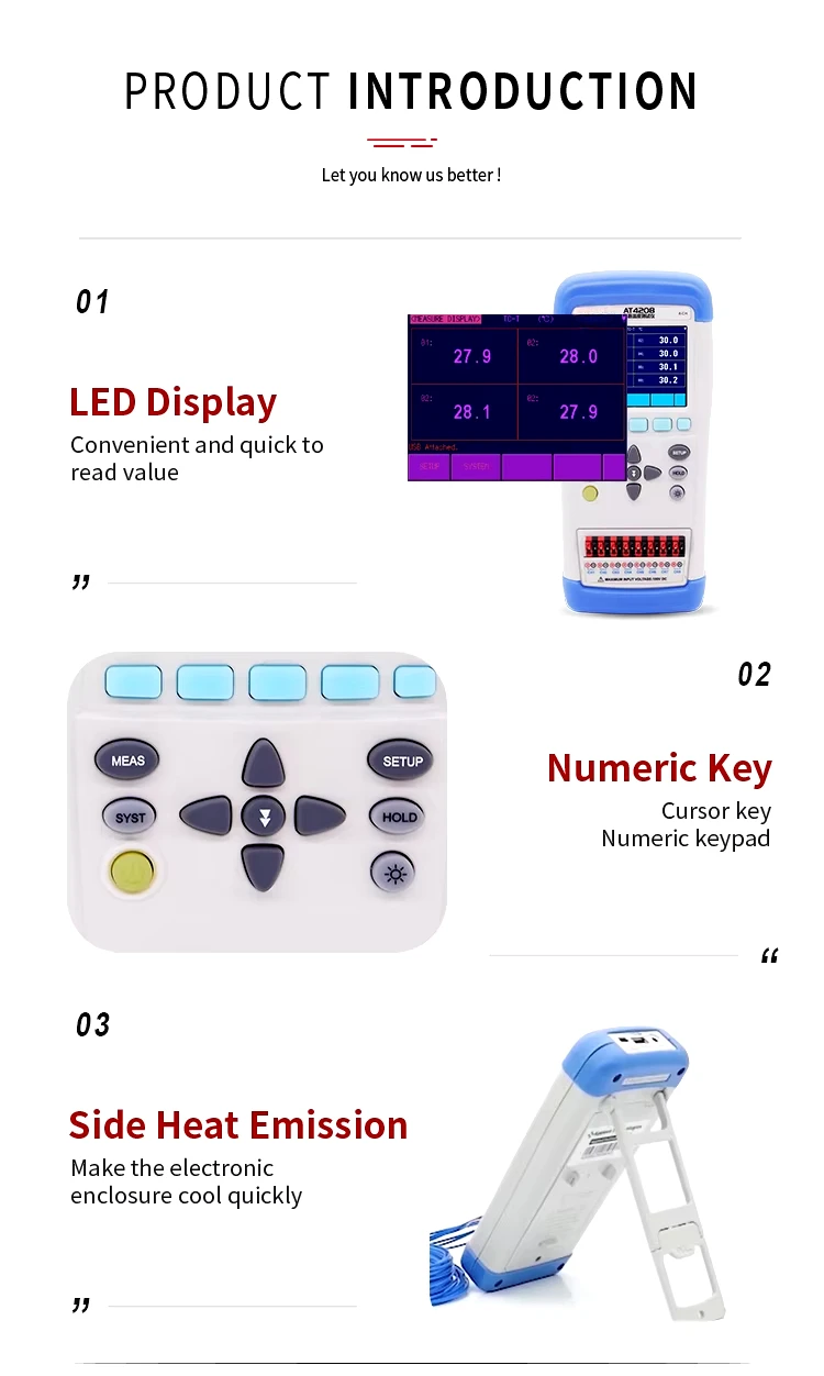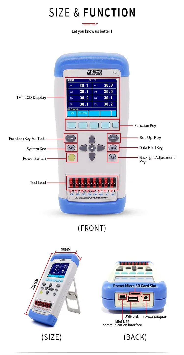 AT42 series handheld multi-channel temperature meter adopts high-performance ARM micro processor, can collect multi-channel temperature data simultaneously and response quickly. AT420 series has the function of broken thermocouple checking, high/low beep function and communication transmission. Ultra-low power consumption and high density SMD assembly technology. True-color TFT liquid crystal display, keypad and touch screen double control. It is Li- battery powered. USB communication. Switch in both English and Chinese.