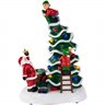 Features Santa surrounded by his sack and Christmas gifts decorating a Christmas tree with 2 gnomes with one atop the tree