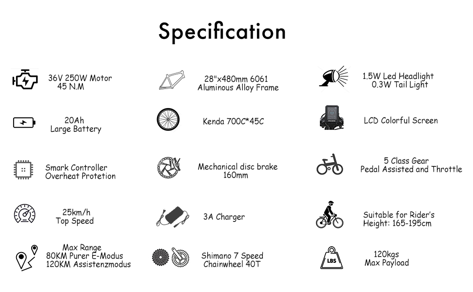 | Spezifikation | Rahmen: 28'' Aluminiumlegierung Vorderradgabel: Stoßdämpfende Vorderradgabel Reifen: 700C*45C Bremse: Scheibenbremsen vorne und hinten Getriebe: Shimano 7 Speed Batterie: 36V 20AH Motor: 36V 250W hinterer Motor Display: LCD Ladegerät: 42V 3A Geschwindigkeit: 25KM/H Bereich: 80-120KM |