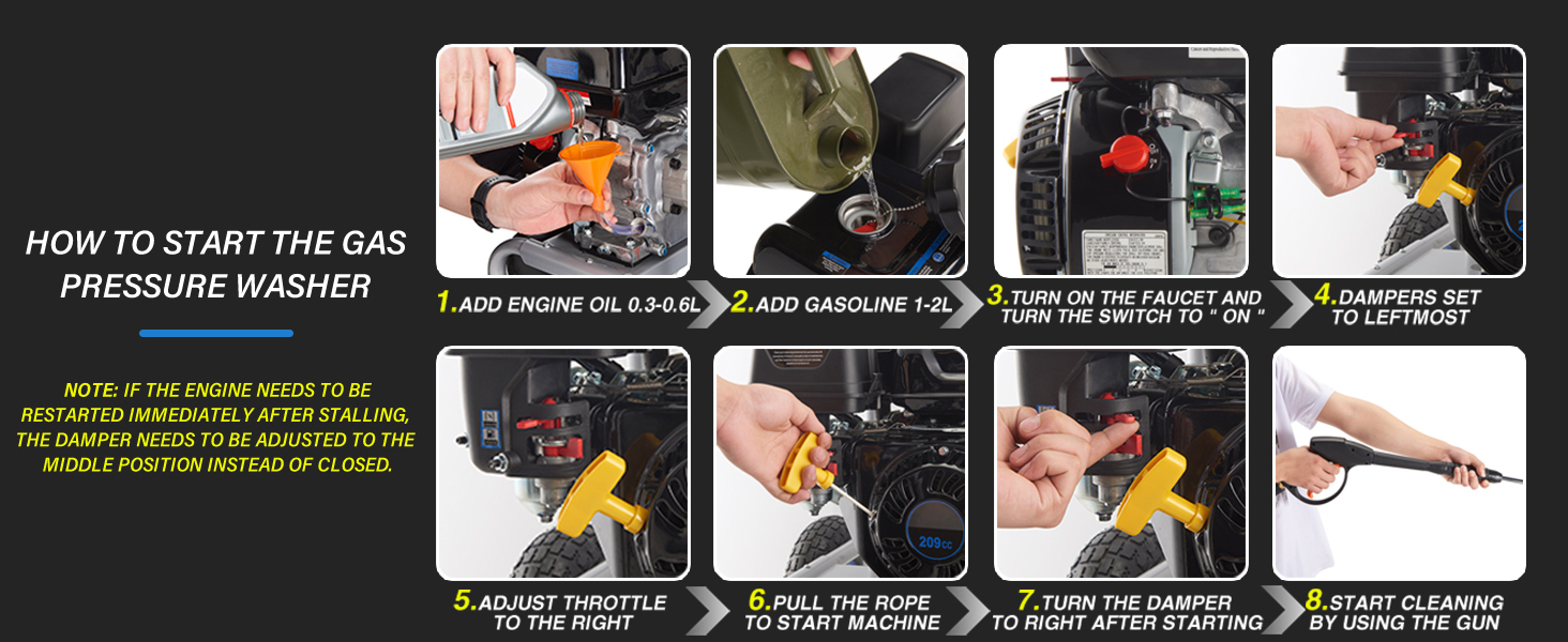 Tips for Use: Use SAE 10W-30 oil, use clean unleaded gasoline with a minimum octane rating of 87, and engine oil should be changed after the first 5 hours and then every 50 hours. All pressure washers are 100% function tested at the factory and may contain minimal residual fuel/oil or fuel odor. Please check for sufficient oil (0.2 gallons) with each use to ensure the efficient operation of the washer.