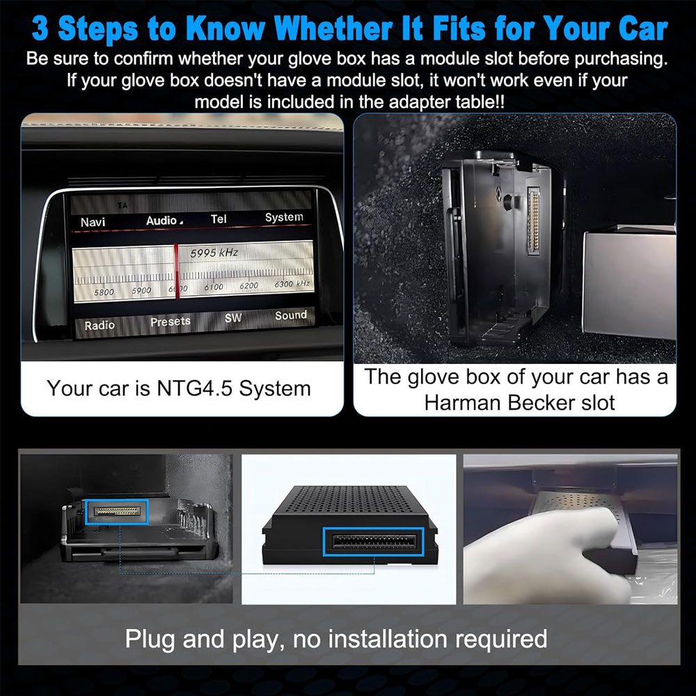 here is no need to dismantle the car, which is convenient and quick. Just plug the module into the glove box (navi dock) with the corresponding interface.