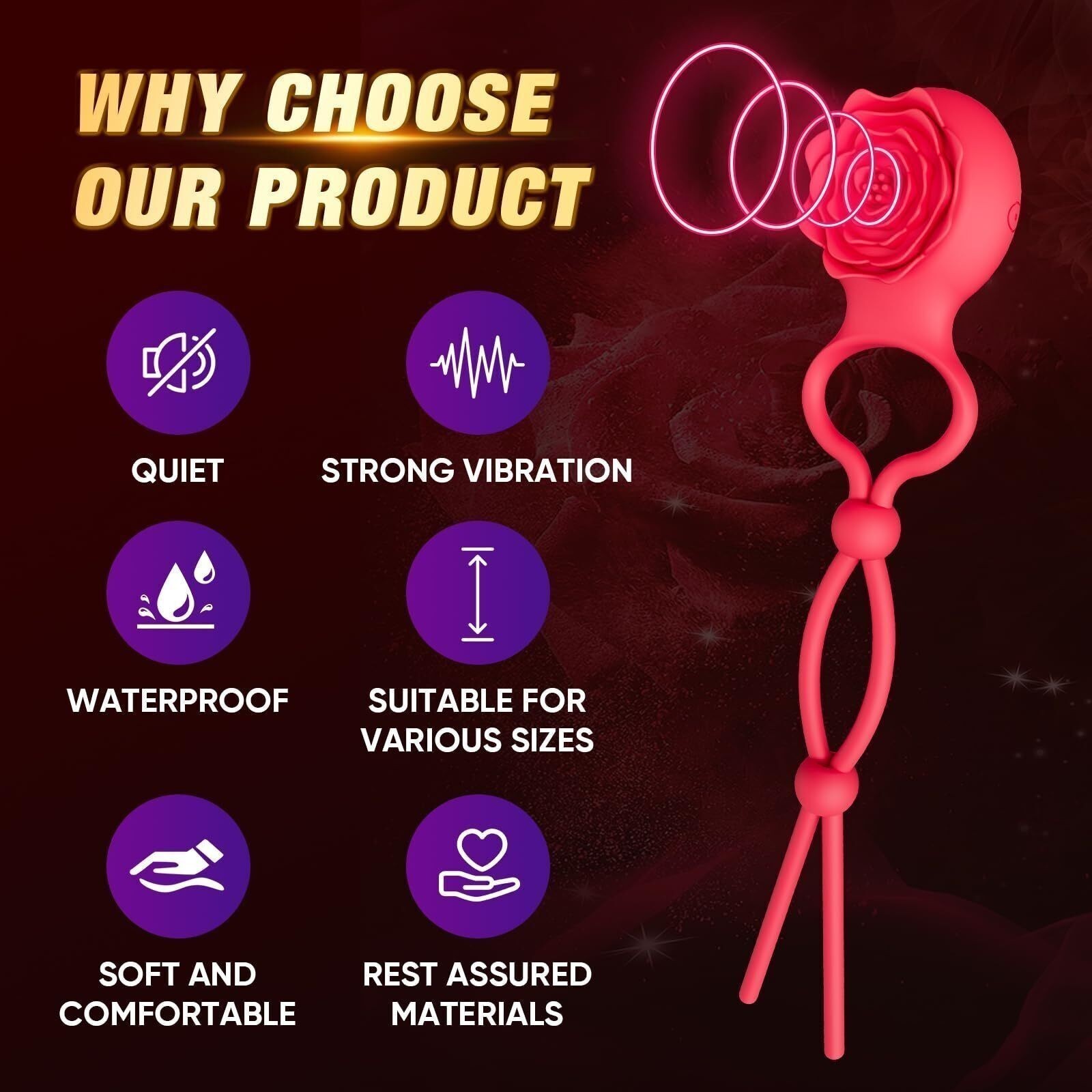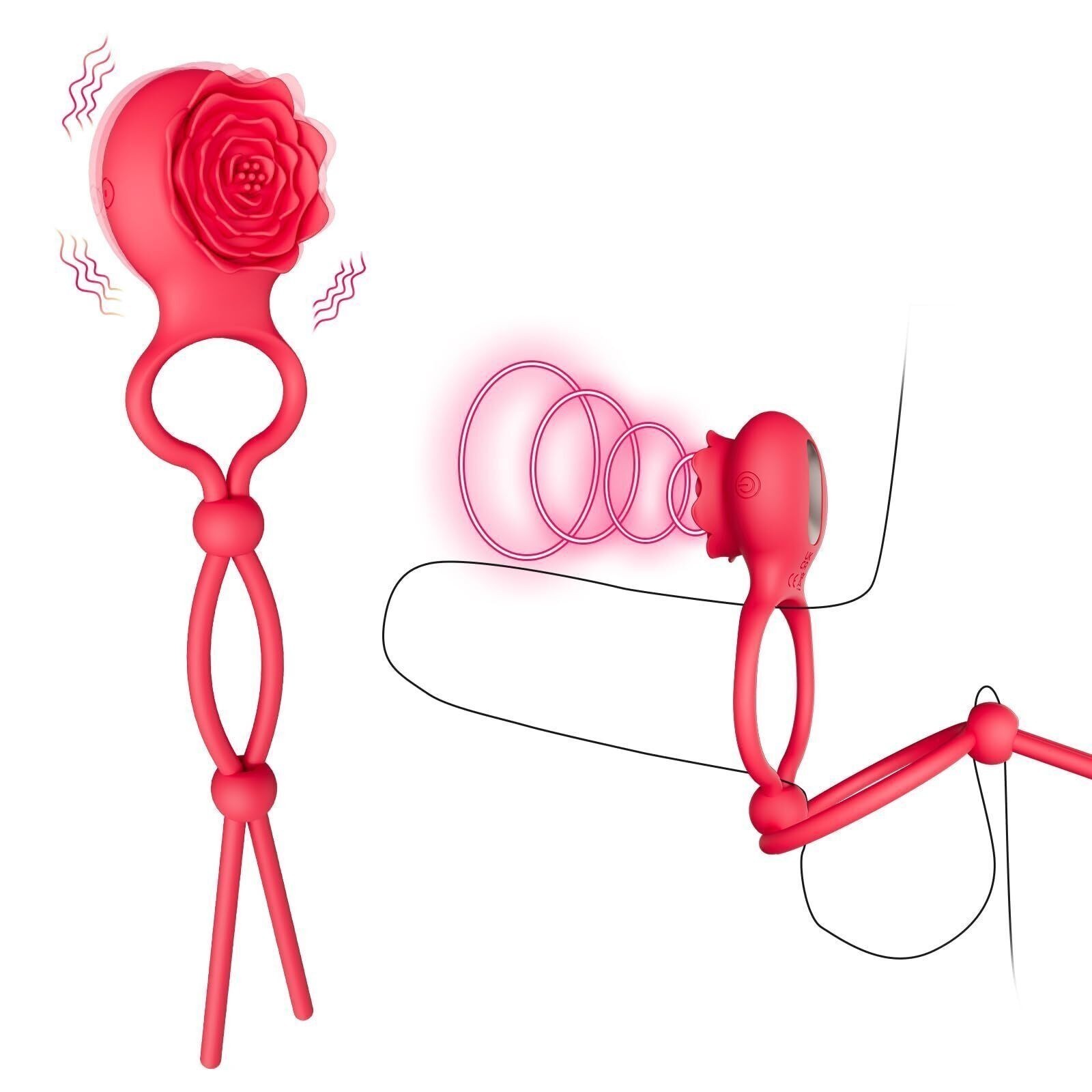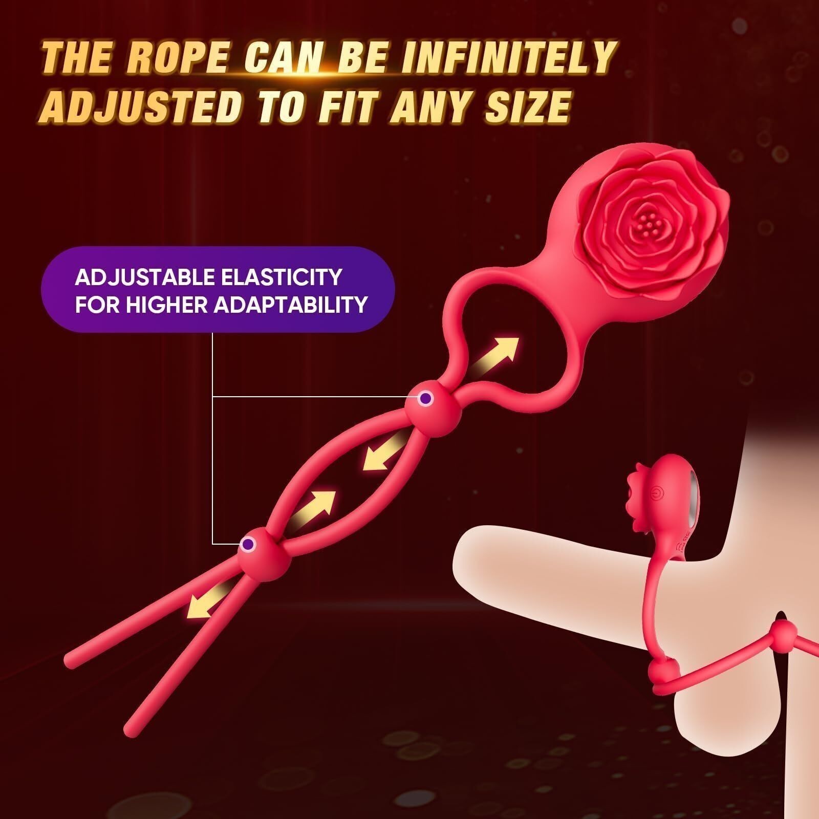 【The First Cock Ring Tie with Rose Shaped Vibrator】- Revolutionary cock ring tie and rose shaped vibrator combination. The cock ring tie can be tied anywhere you want to get the tightness you want, while the petal-shaped design of each layer creates a truly larger, multifaceted experience for labia, urethral openings, and other sensitive spots. Layered sensations radiate throughout your body, propelling both parties to unforgettable orgasms.