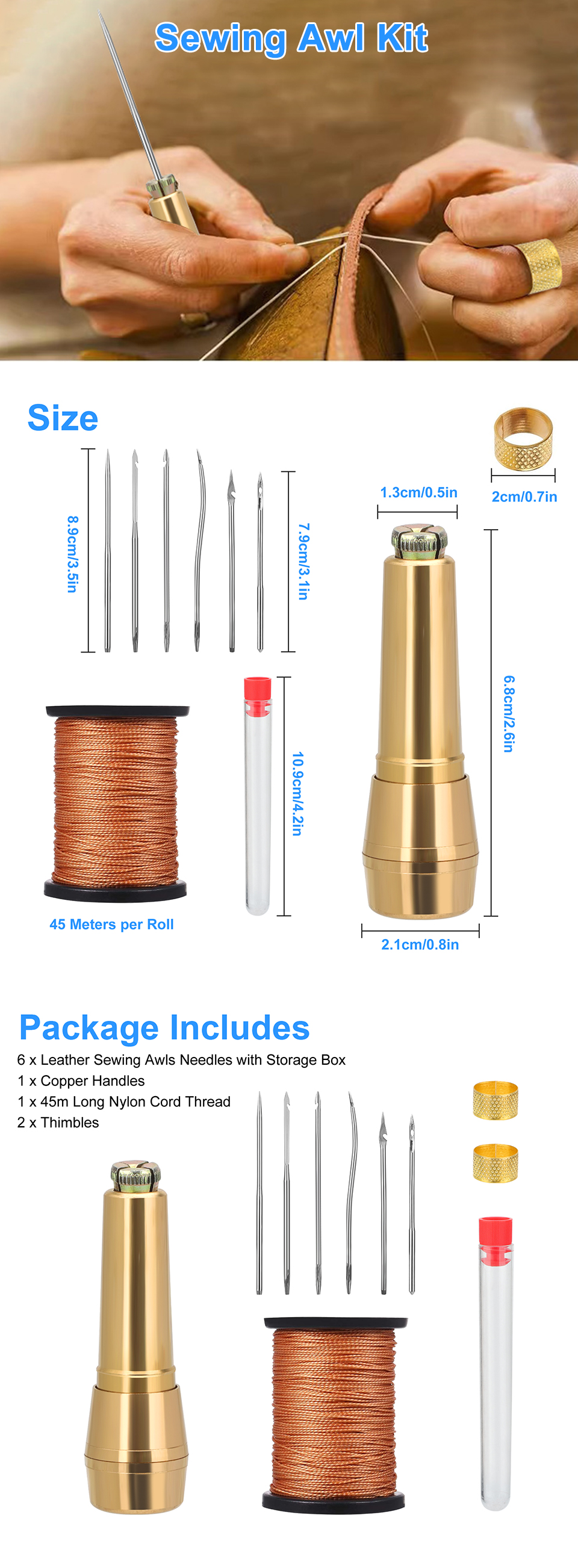 Package Includes: the package comes with 6 pieces of canvas leather sewing awls needles, 1 piece of copper handles, 1 roll of 45 m long nylon cord thread and 2 pieces of thimbles, totally 10 pieces of handmade leather sewing tools