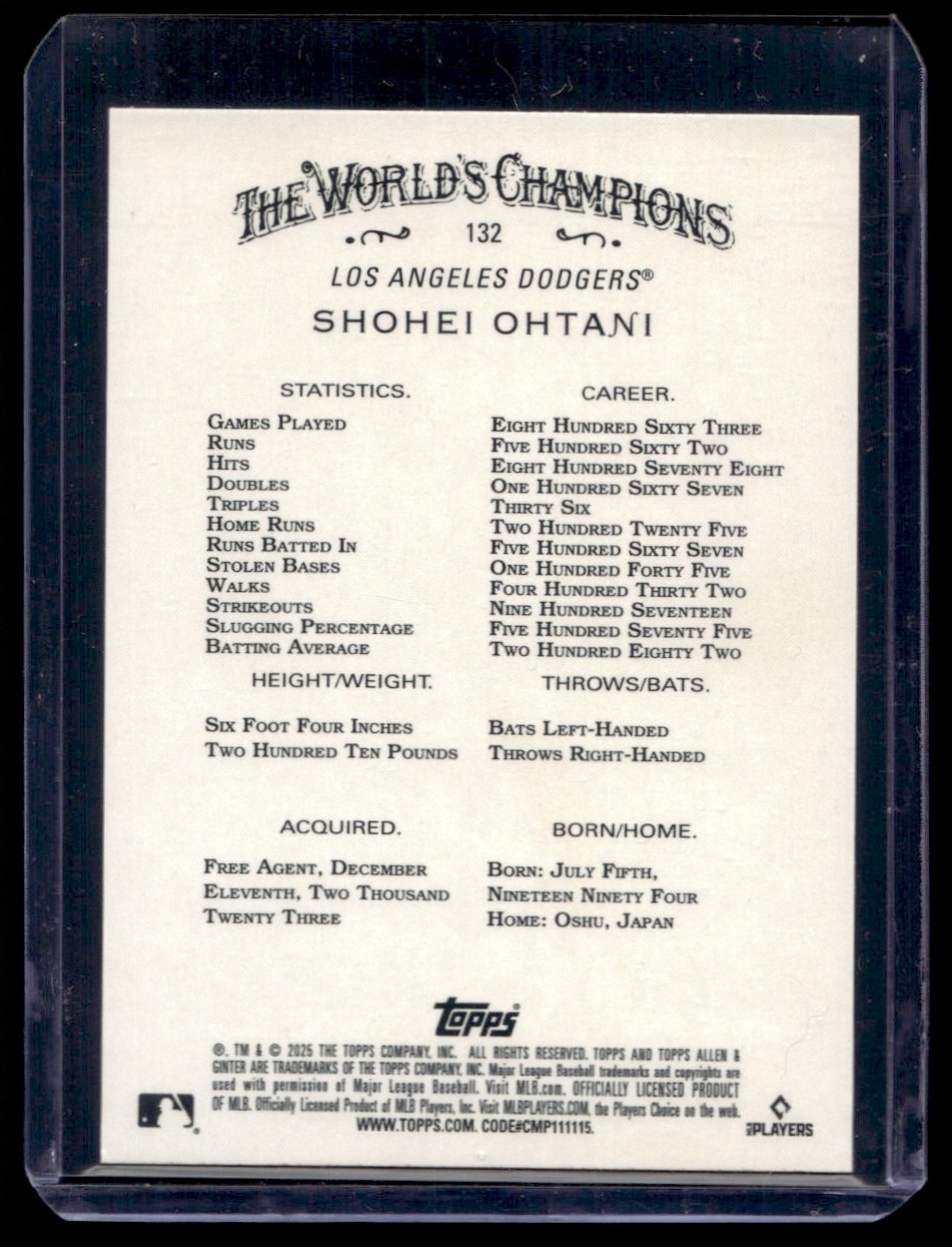 | Description: | Shohei Ohtani | | Category: | Baseball | | Year: | 2025 | | Product: | Topps Allen & Ginter Silver Foil | | Team: | Los Angeles Dodgers | | Card Number: | 132 | | Dimensions: | 3¾" x 3" | | SKU: | BL B0188 R01 D (20) |