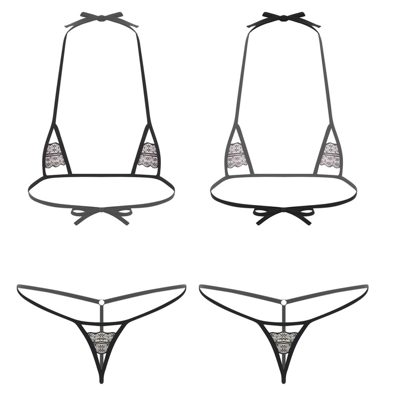 Front with see-through lace design, open butt and minimal coverage.