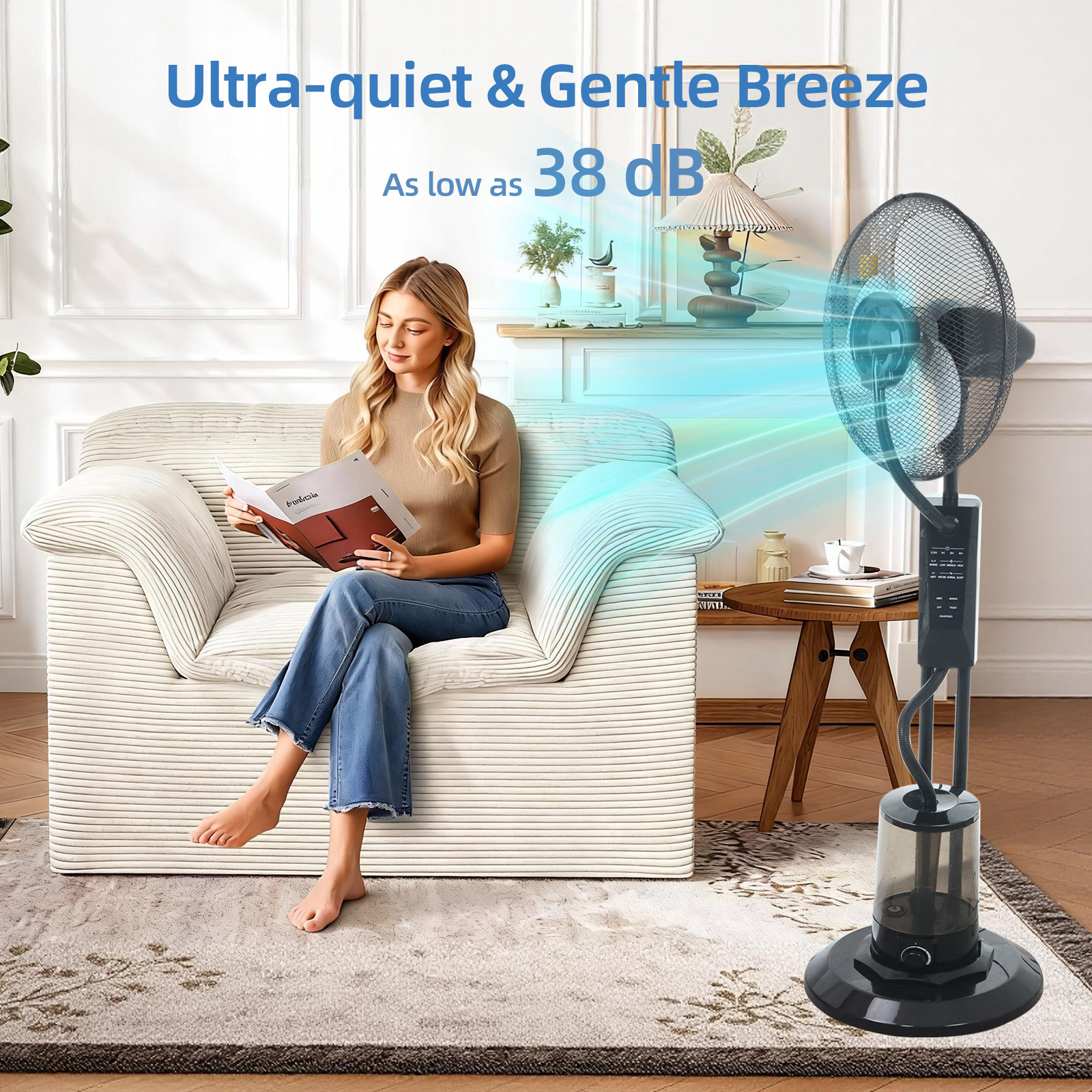Enhanced Cooling Effect: The fan efficiently disperses a fine, cool mist, providing a refreshing breeze.