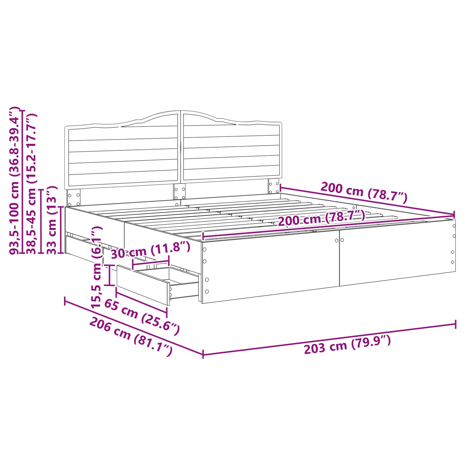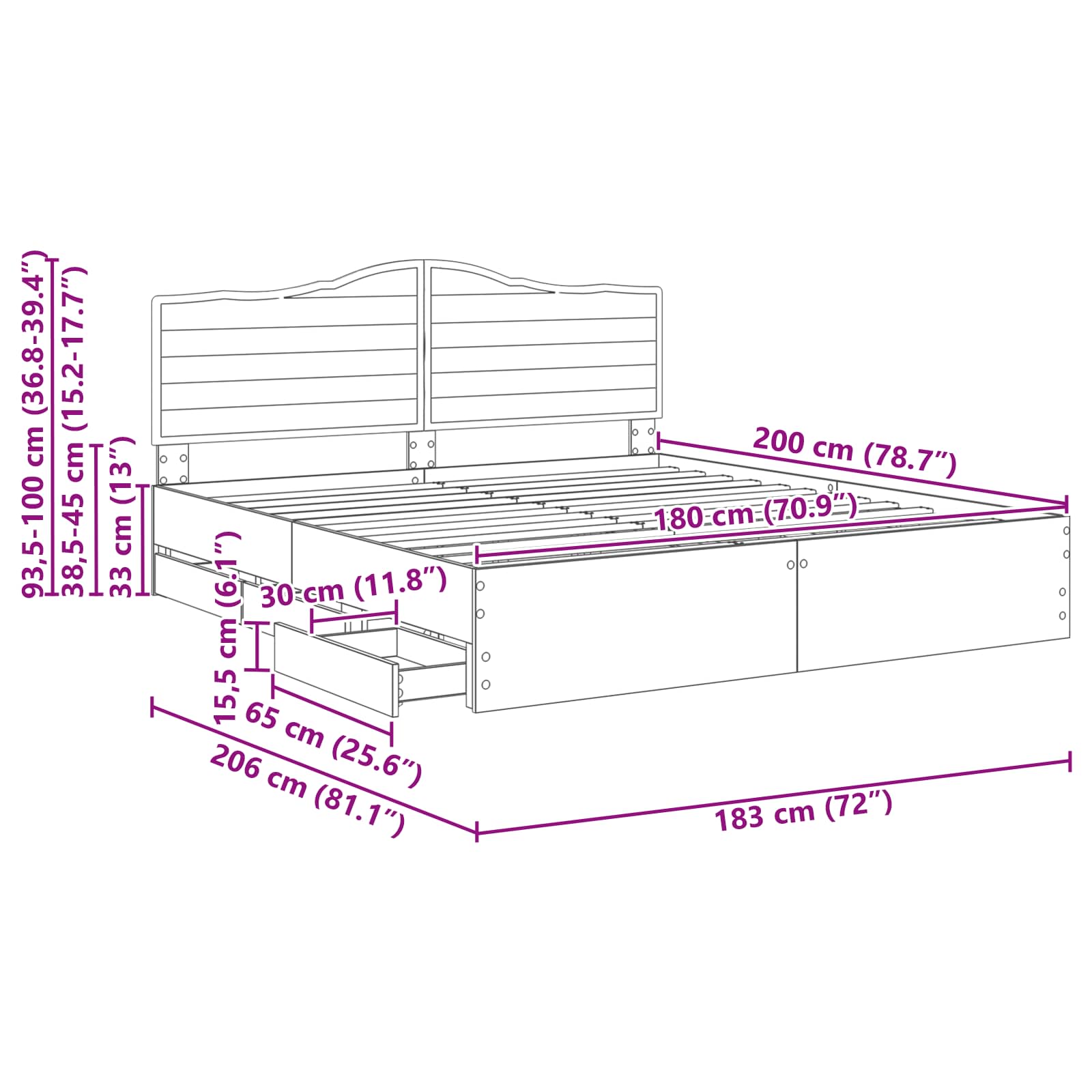 Dimensione della testiera: 203 x 3 x 100 cm (L x P x A)