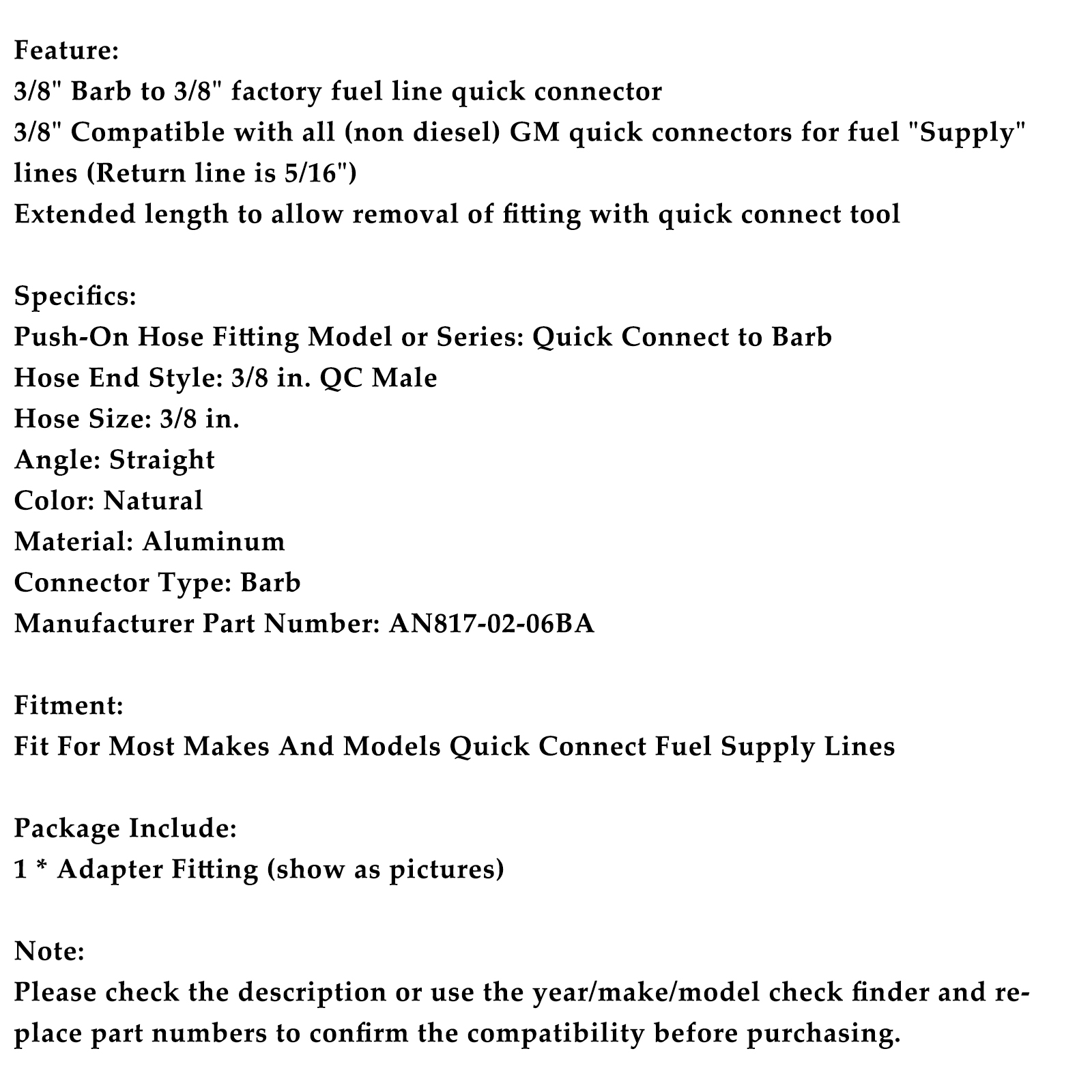 3/8" Compatible with all (non diesel) GM quick connectors for fuel "Supply" lines (Return line is 5/16")