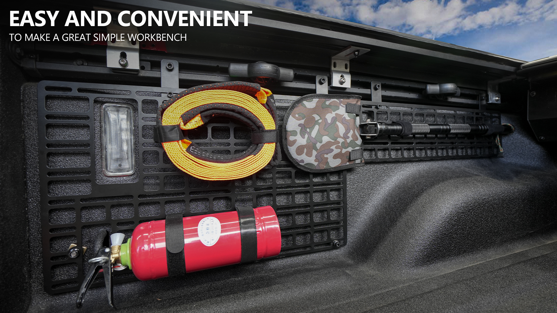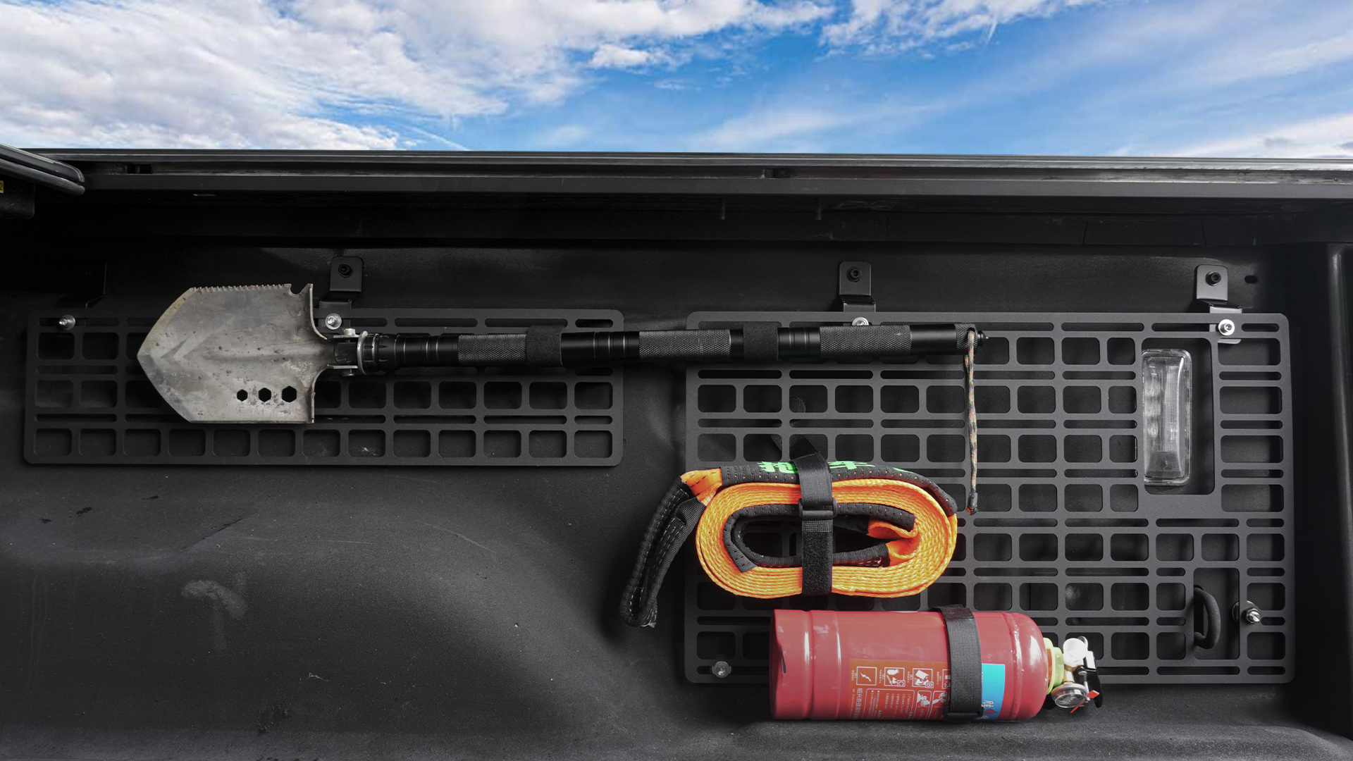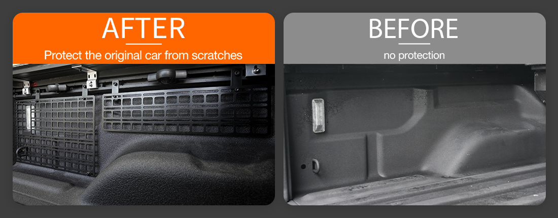 3.Various Function: Truck bed molle panels can be well organized and stored all kinds of tools, avoid being placed in the pickup bucket and the items collide with each other while driving.