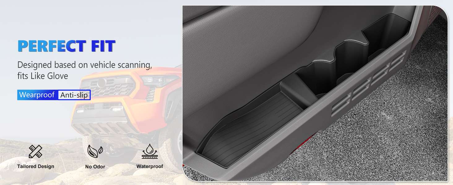 2.Premium Material:The car door side storage box compatible with Toyota Tacoma car door organizer are made of premium quality TPE with no bad smell.They are highly wear-resistant and flexible,and ensure long-lasting performance in various environmental conditions.Also they are waterproof and easy to clean,you could use them for a long time.