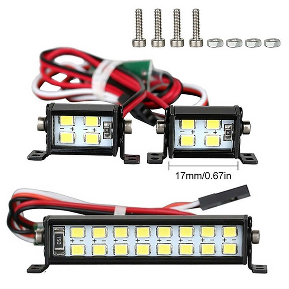 burst flashing, on and off functions. Default power on is always on Input voltage: 5-8.4V Lamp length: 17mm / 52mm / 102mm / 146.7mm Number of lights: 4/16/32/48 Lighting mode: breathing, blinking, power on and off (default power on is always on). Shell material: metal Supporting material: metal Light color: white Suitable models: For SCX10 D90 TRX4 1/10 RC It can be installed on the tube frame model, and can also be installed on the hood and bumper. Package Included: