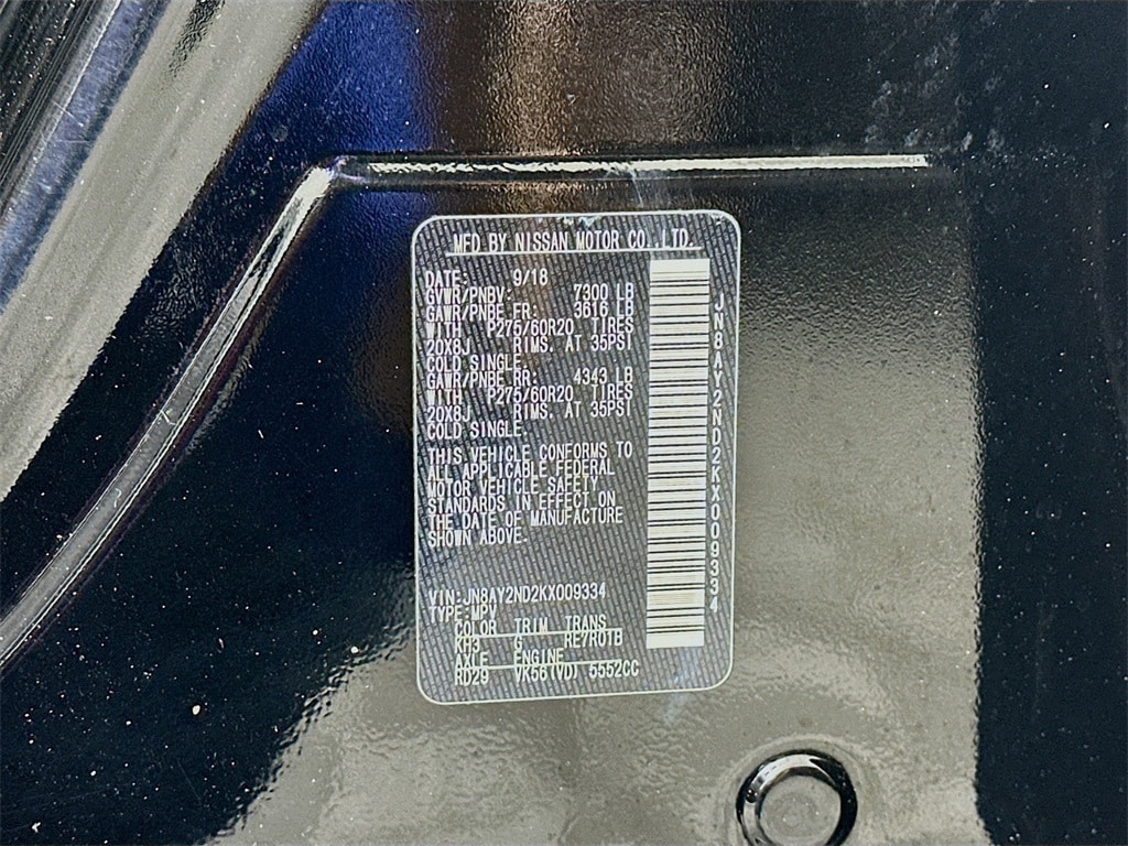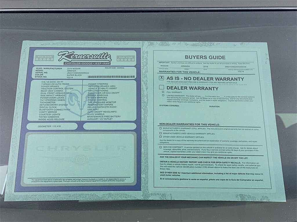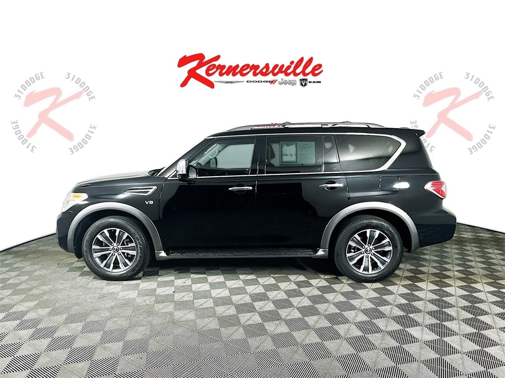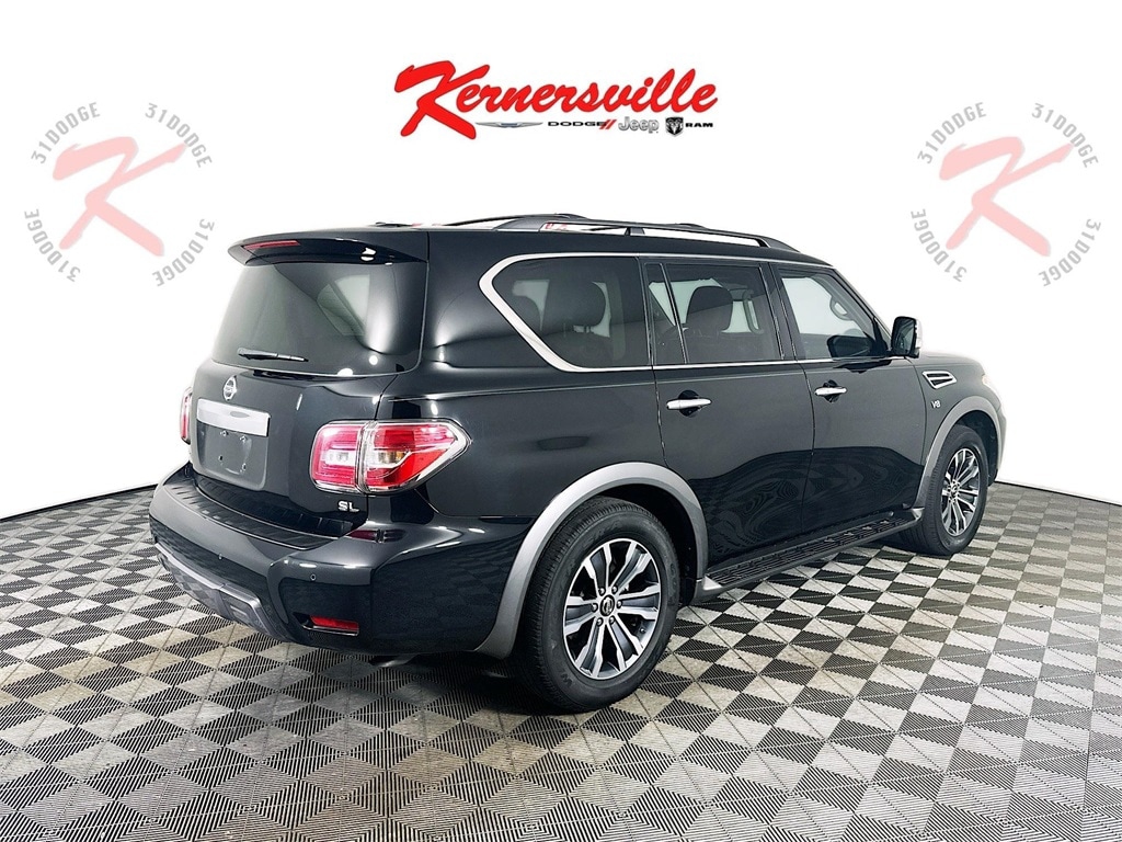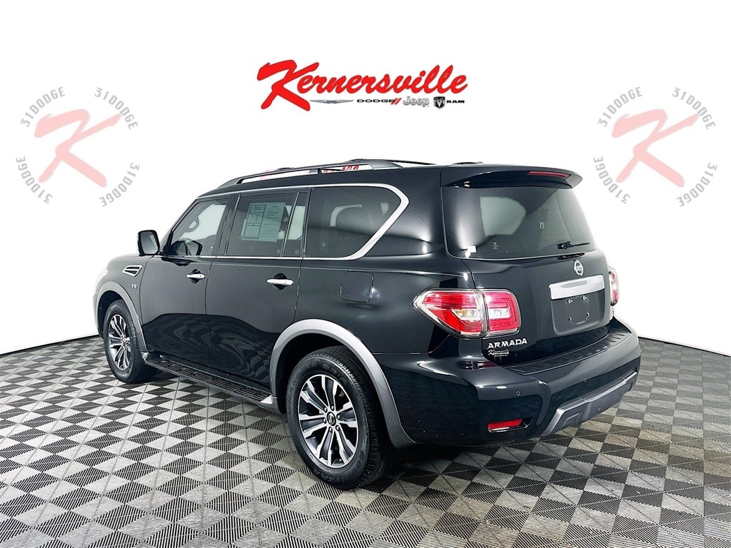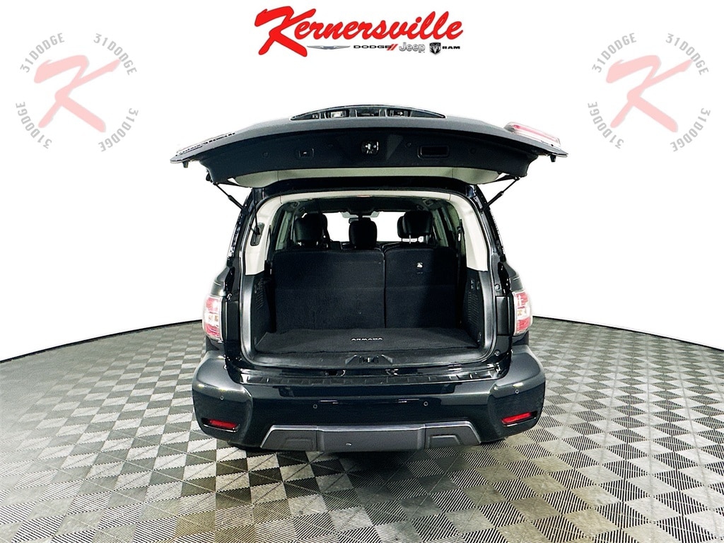 When calling or emailing, please reference stock number Y0214.MORE ABOUT THIS 2019 Nissan Armada SL SUV SL trim! Rear wheel drive! 5.6L V8 engine! 7 speed automatic transmission! Intelligent key with push button start! Blind spot warning! Rear cross traffic alert! Forward collision warning! Backup camera! Front and rear parking sensors! Power liftgate! Leather appointed seating! Heated front seats! Power adjustable driver and passenger seats! Memory driver seat! Heated leather wrapped steering wheel! Dual zone automatic climate control! Bose premium audio system! Touchscreen infotainment system with navigation! Bluetooth handsfree calling! Power sunroof! This 2019 Nissan Armada SL 2WD in Super Black with Charcoal leather interior delivers full size SUV strength, V8 power, and refined comfort. The proven 5.6 liter V8 engine paired with a smooth 7 speed automatic transmission provides confident acceleration, highway passing power, and impressive towing capability for family travel or recreational use. Advanced safety features include blind spot warning, rear cross traffic alert, forward collision warning, front and rear parking sensors, a rear backup camera, stability control, traction control, and a comprehensive airbag system to support everyday confidence behind the wheel. Inside, the Armada SL offers a spacious three row cabin with leather appointed seating, heated front seats, power adjustable front seats with memory for the driver, and a heated leather wrapped steering wheel. Dual zone automatic climate control, rear air vents, and ample interior storage keep passengers comfortable on long trips. Technology highlights include a touchscreen infotainment system with navigation, Bluetooth connectivity, steering wheel mounted controls, and a Bose premium audio system for clear sound throughout the cabin. Exterior features such as the power liftgate, sunroof, chrome accents, roof rails, privacy glass, and bold Nissan styling complete this well equipped full size SUV. With its blend of performance, space, and comfort, this Armada SL is an excellent choice for families needing capability without sacrificing refinement. Kernersville Chrysler Dodge Jeep Ram is the LARGEST truck dealer in the Southeast for two years in a row. We have the largest selection of trucks and over 1900 vehicles in stock at all times. We aim to truly be the lowest priced in the market and we do so by price checking our inventory every day and dropping our price to remain in the TOP 3 LOWEST PRICED. Shop at the most convenient dealer in the USA, available online! Shop at Kernersville Chrysler Dodge Jeep Ram! Hablamos Espanol - llame hoy.