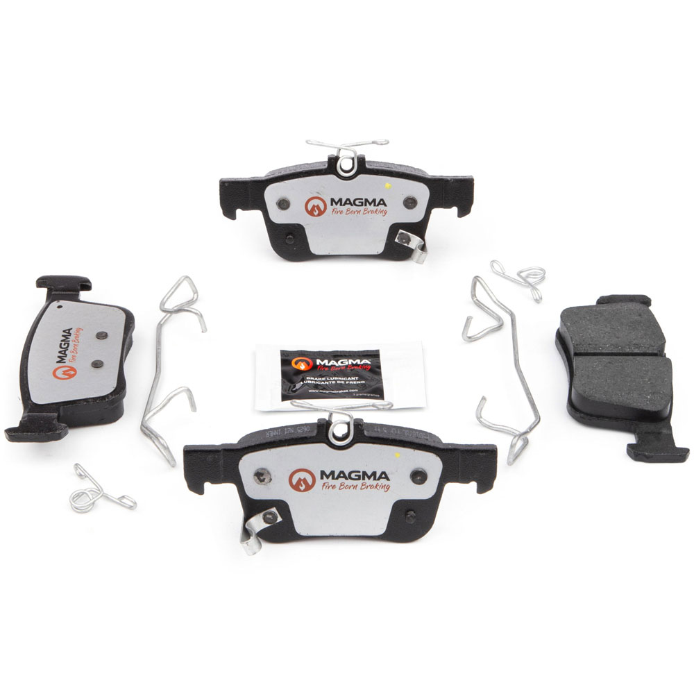 WHY MAGMA? - Today's harsh stop and go environment can create very high heat levels in your braking system which can reduce the vehicle's ability to stop. Extreme high temperatures can be reached in many braking situations such as - Stop and Go Traffic, Mountain Driving, Hauling or Towing, Emergency Stops, Spirited Driving and Long, Sustained Braking. At MAGMA Brakes, we use FIRE to fight FIRE. Our brake system components are made using advanced, state of the art techniques and treatments that ensure our brakes will stand up to the heat.MAGMA Pro-Series brake pads feature...1. Scorched, copper free friction formulations for overall ltimate braking performance2. Vulcanized OE style rubber core shims for unsurpassed noise suppression3. Heat-tempered upgraded dual-coated stainless steel hardware kits to restore the brake pad to caliper interface to ""like new"" condition (where applicable)4. Heat expansion OE style slots and chamfers to dissipate noise and stand up to the heat5. High-heat resistant brake lubricant included for lubricating critical points during pad installation