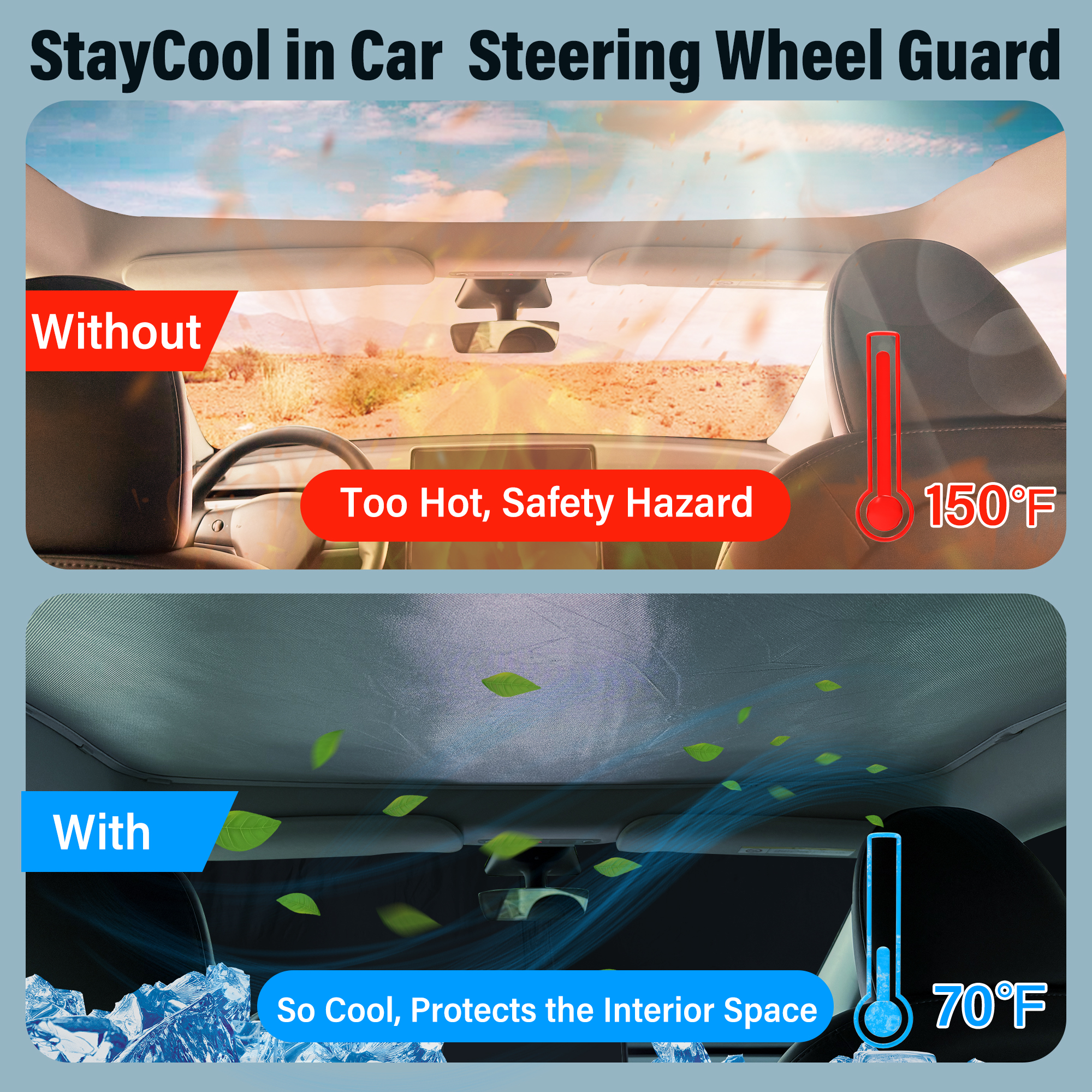 [Ultimate Cooling and Sun Protection] With a four-layer structure—Reflective, Insulation, Ice Point, and Protective layers, it completely blocks heat transmission. Compared to without roof sunshade, the temperature can drop by up to 30°F, keeping your car interior at a comfortable 75°F, keep it cool at all times. Whether commuting in the city or on a long road trip, it maintains a cool environment, enhancing your driving experience