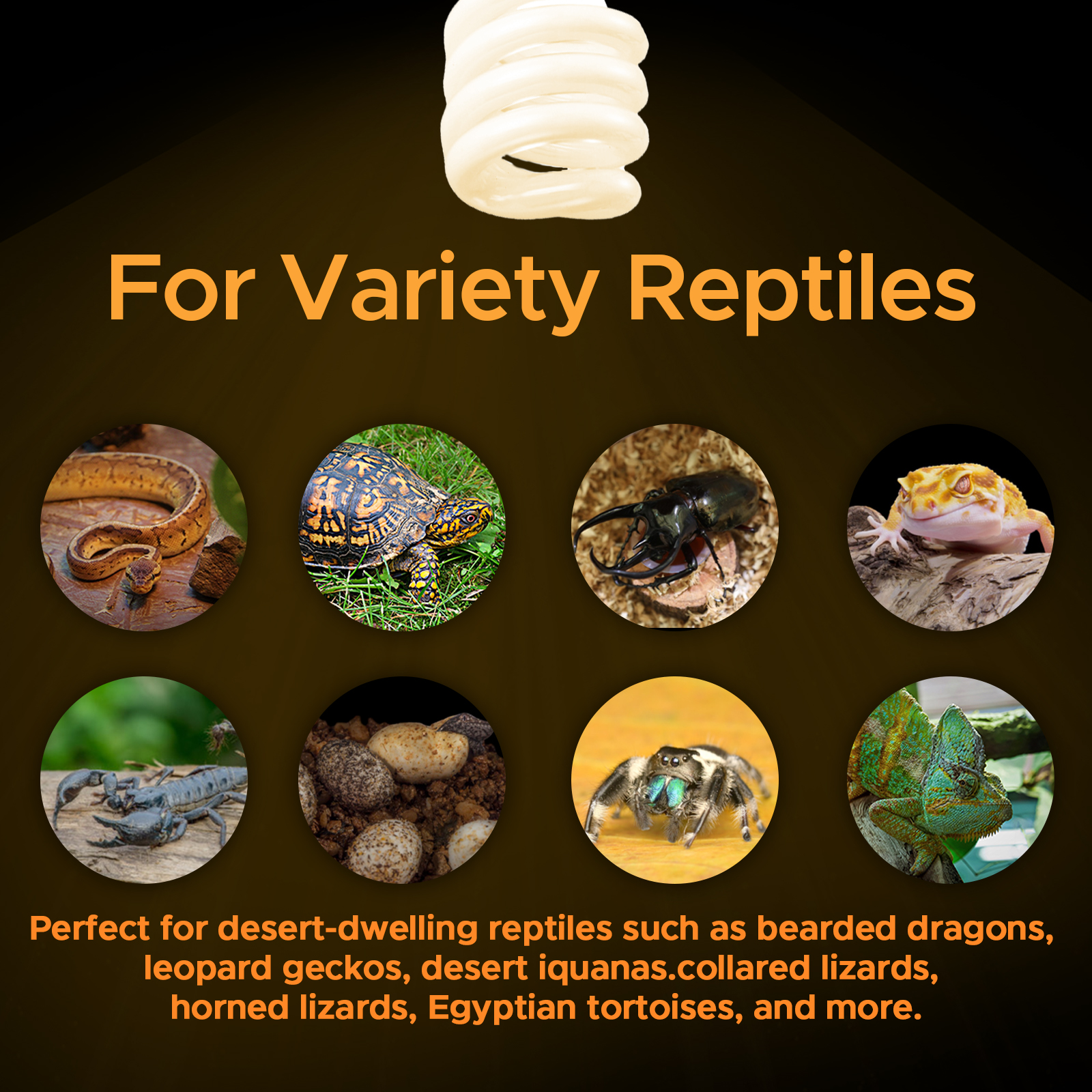 - High Performance: Easy to install with an E26 base, this Desert UVB CFL Reptile Bulb provides stable UVB and UVA output with no harmful UVC emissions. Always keep your lamp at least 15 cm away from your reptiles.