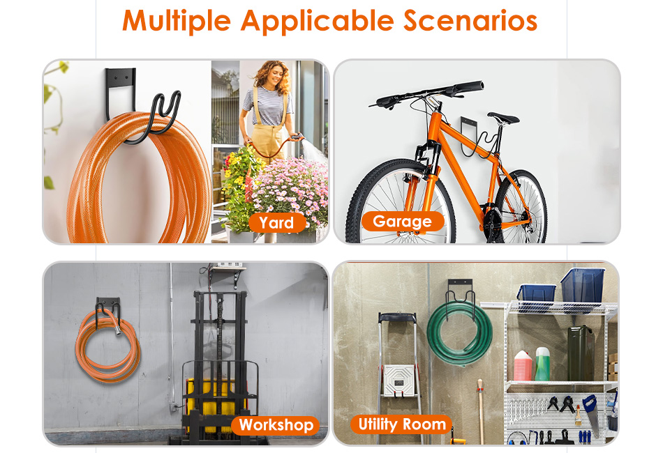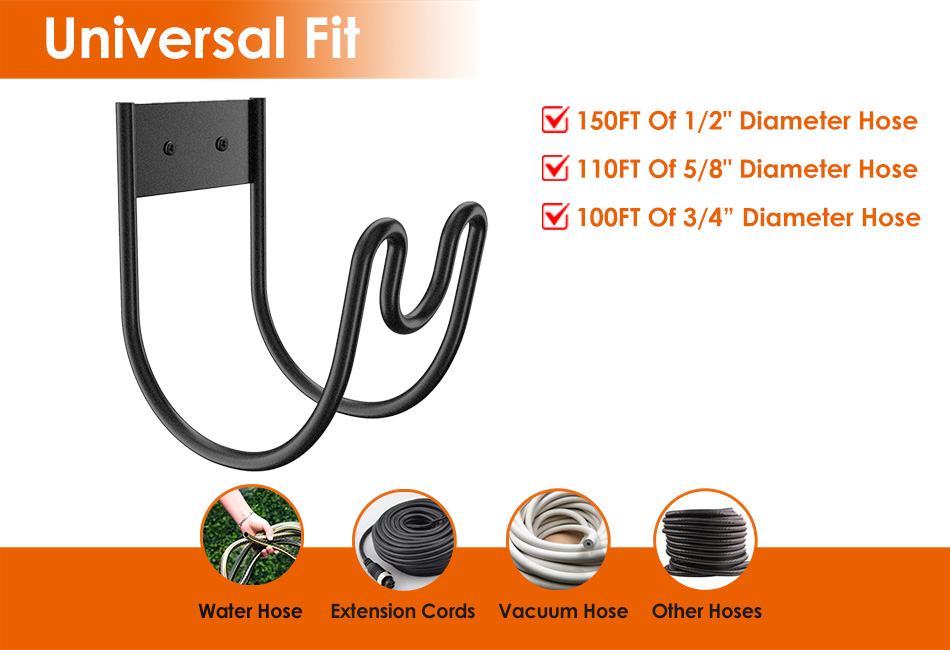 - Wide Applications:Our hose rack fits any size of hose,such as 25ft,50ft,75ft,100ft and so on. Widely used for water hoses,extension cords,vacuum hoses,pool hose hangers,strollers,bikes,etc.. Hold up to 150ft of 1/2" diameter hose, 110ft of 5/8" diameter hose,100ft of 3/4” diameter hose and more.