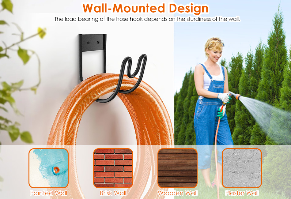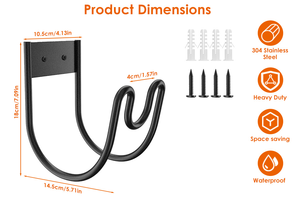 2Packs Hose Rack Product Detail Image Gallery Product DescriptionOverview:Made from premium 304 stainless steel, our hose hanger is waterproof and rust-resistant, able to withstand withstand rainy weathers. The built-in unique nozzle placement slot allows for quick location of the hose head. Fit any size of hose, such as 25ft, 50ft, 75ft, 100ft and so on. Widely used for water hoses, extension cords, vacuum hoses, pool hose hangers, strollers, bikes, etc.. Easy to install on the surface of painted wall, brisk wall, wooden wall or plaster wall. Features:- Unique U-shaped Nozzle Slot:Built in a unique nozzle placement slot,our hose holder allows you to quickly locate the hose head while keeping the hose neatly organized and aesthetically pleasing. This enhances convenience of use and improves the overall tidiness of the yard,preventing messy hose placement.