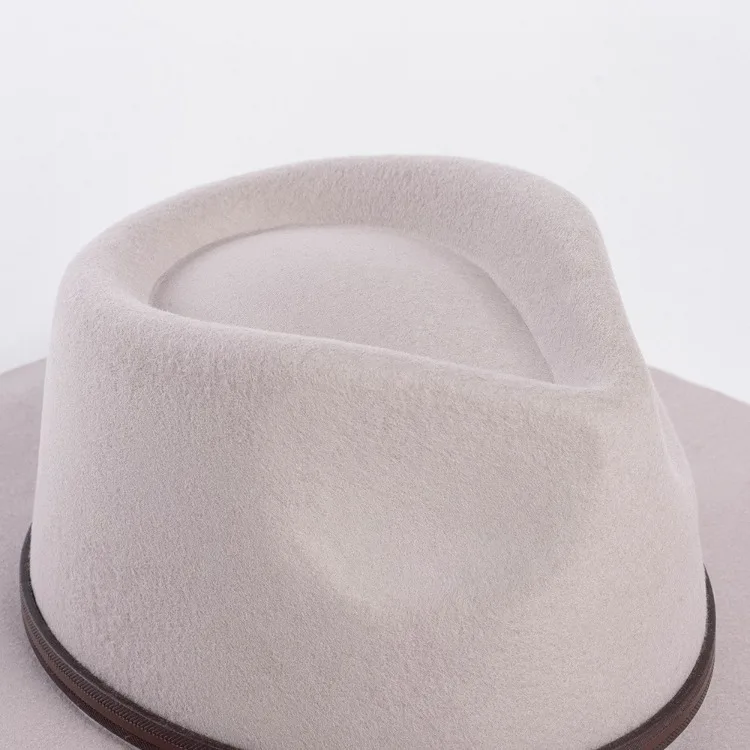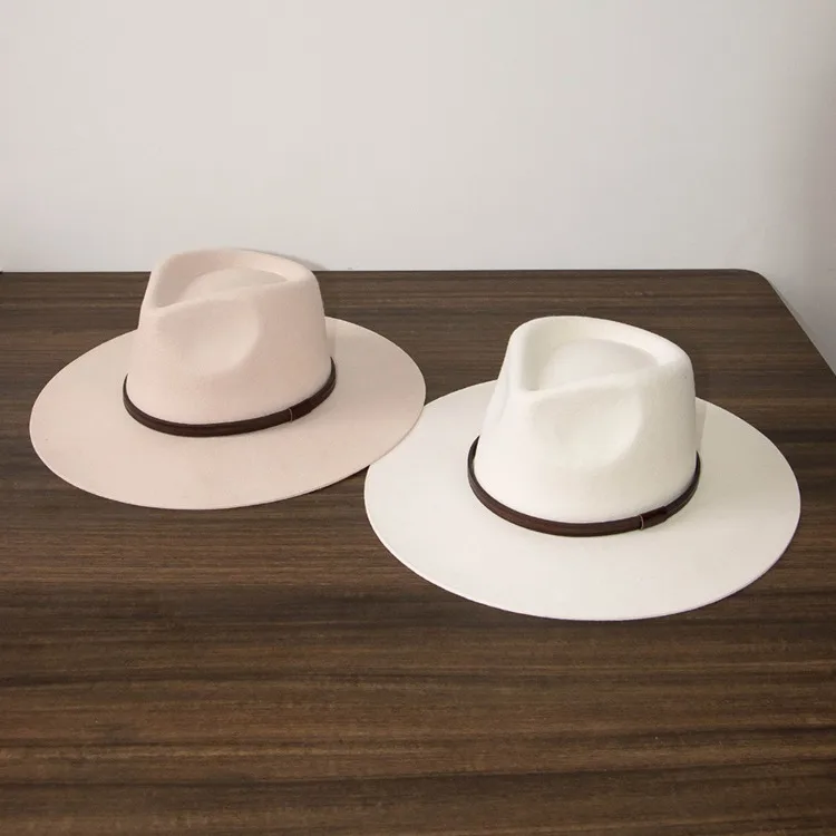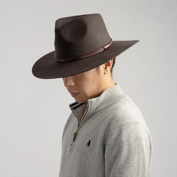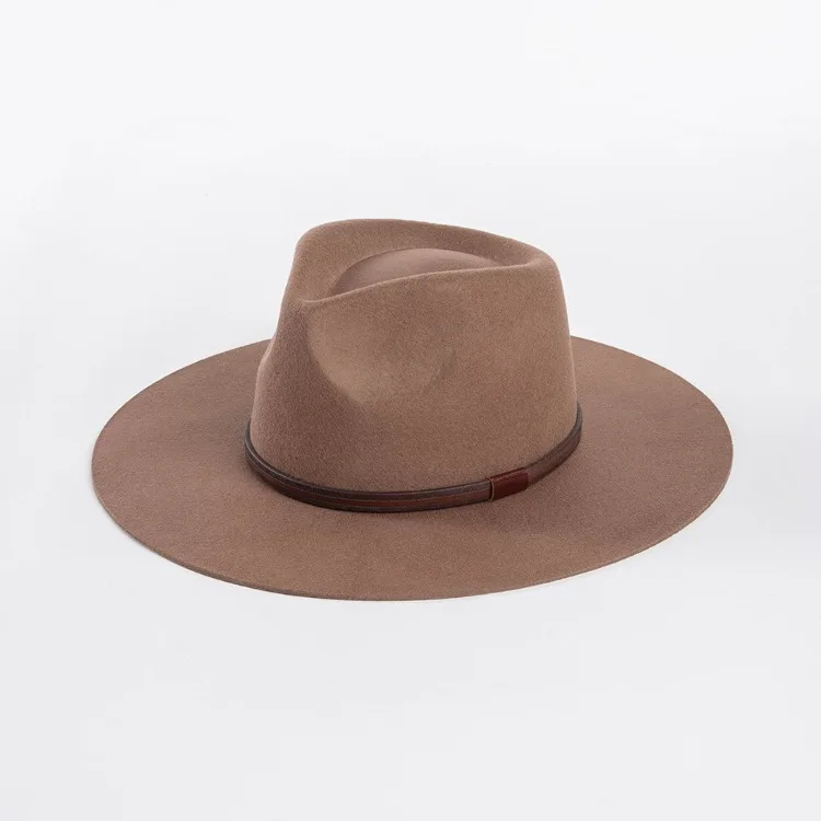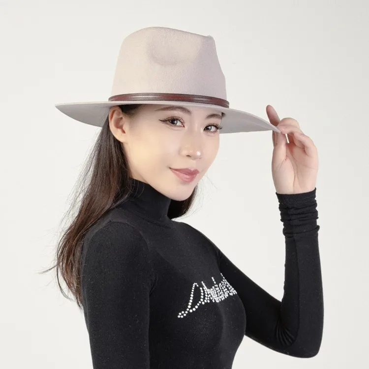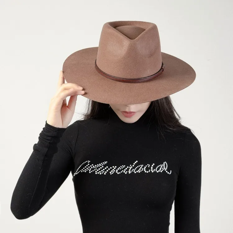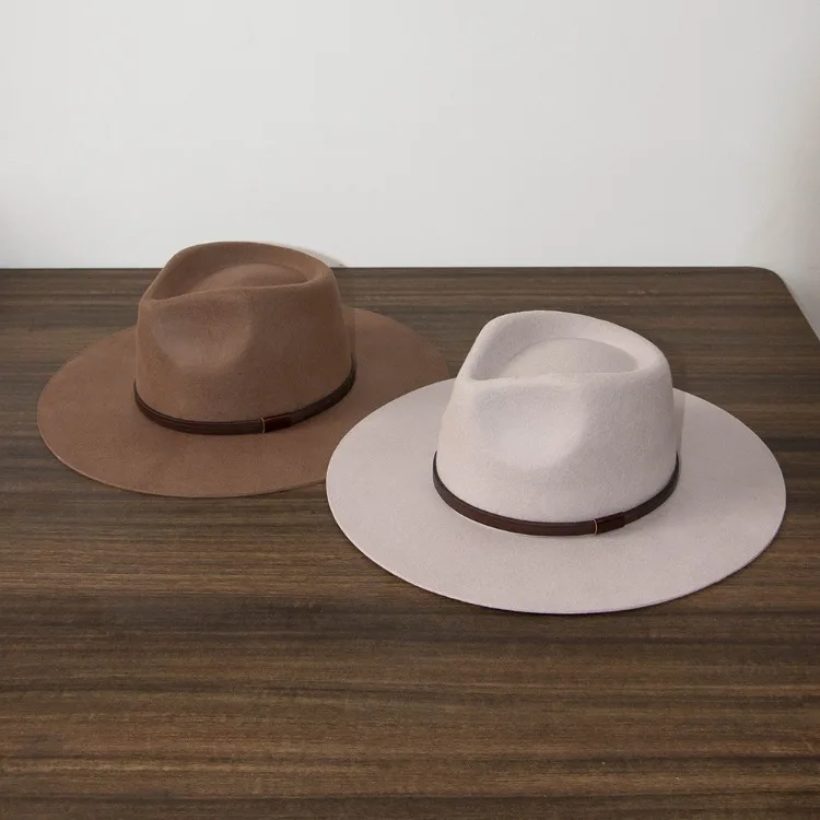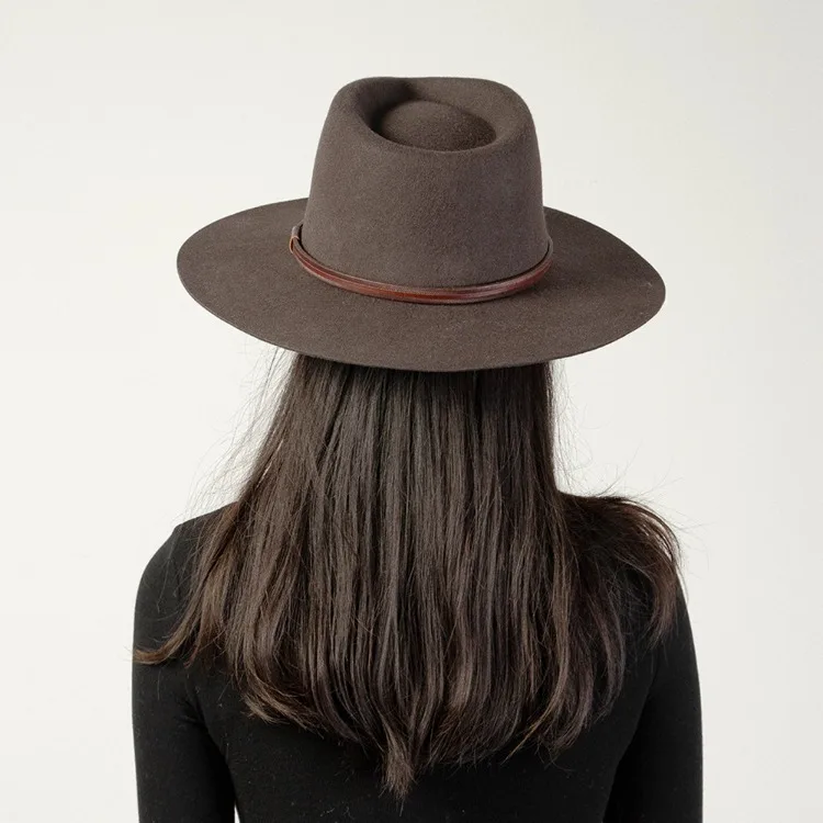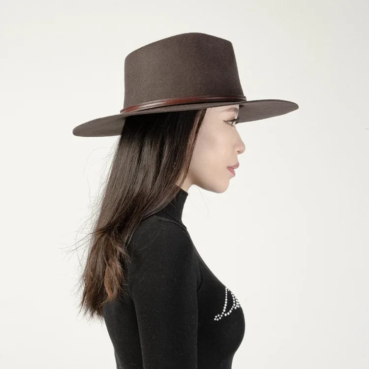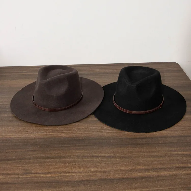 Fashion Vintage Brown Wool Fedora Hat with Belt for Women Men Autumn Winter Unisex Wide Brim Warm Felt Hat