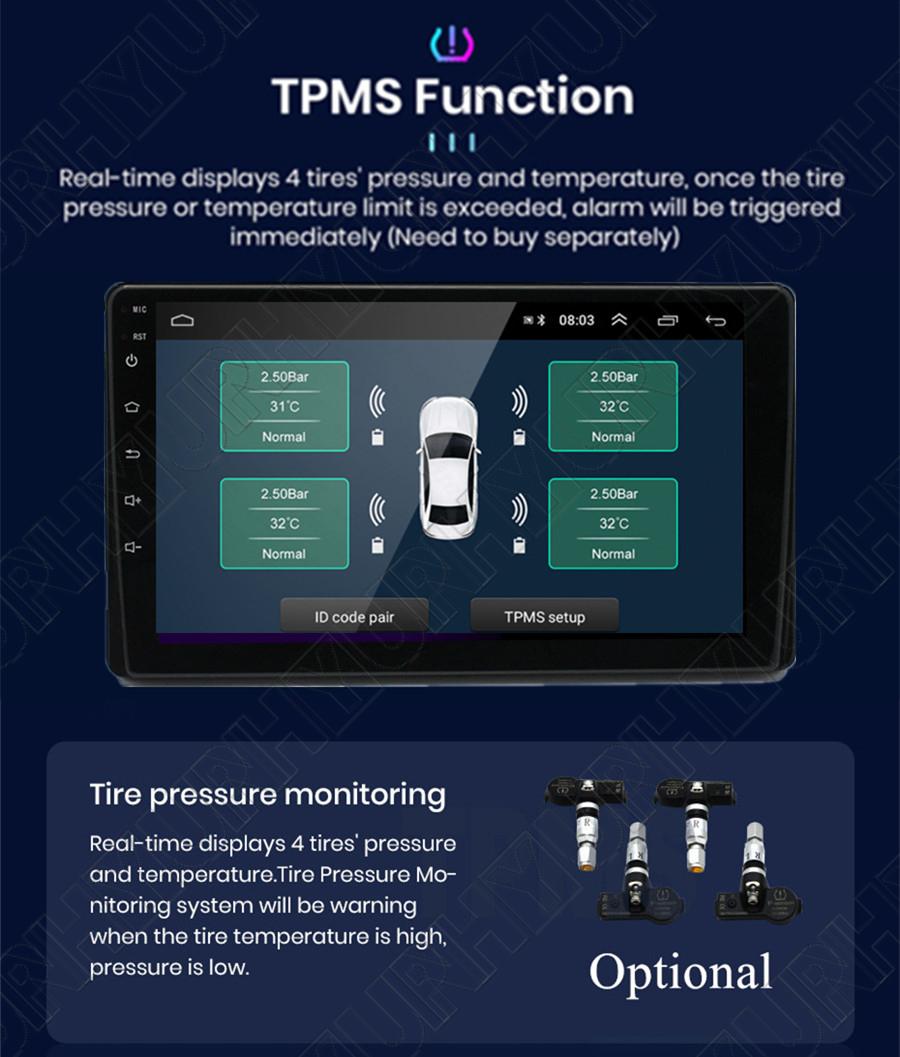 Additional | - Textbook: Could change font, font color, background color, bookmark, reading E-book while listening music - Photo Viewer: Support JPS, BMP, PNG, GIF etc. format. play by revolve, Powerpoint Support 4096*4096 Pixels - Wallpapers: 5 live wallpapers, 17 standard wallpapers, support DIY wallpaper from Gallery - APK Installer: Support Android Package installer - Support Torque Pro(OBD2 &Car): Yes, you can connect a Bluetooth OBD2 Scanner Tool to use this function - Support Mirror Link function: Yes, support screen mirroring from iPhone and android smartphone - Support TPMS: YES (Not Included) |