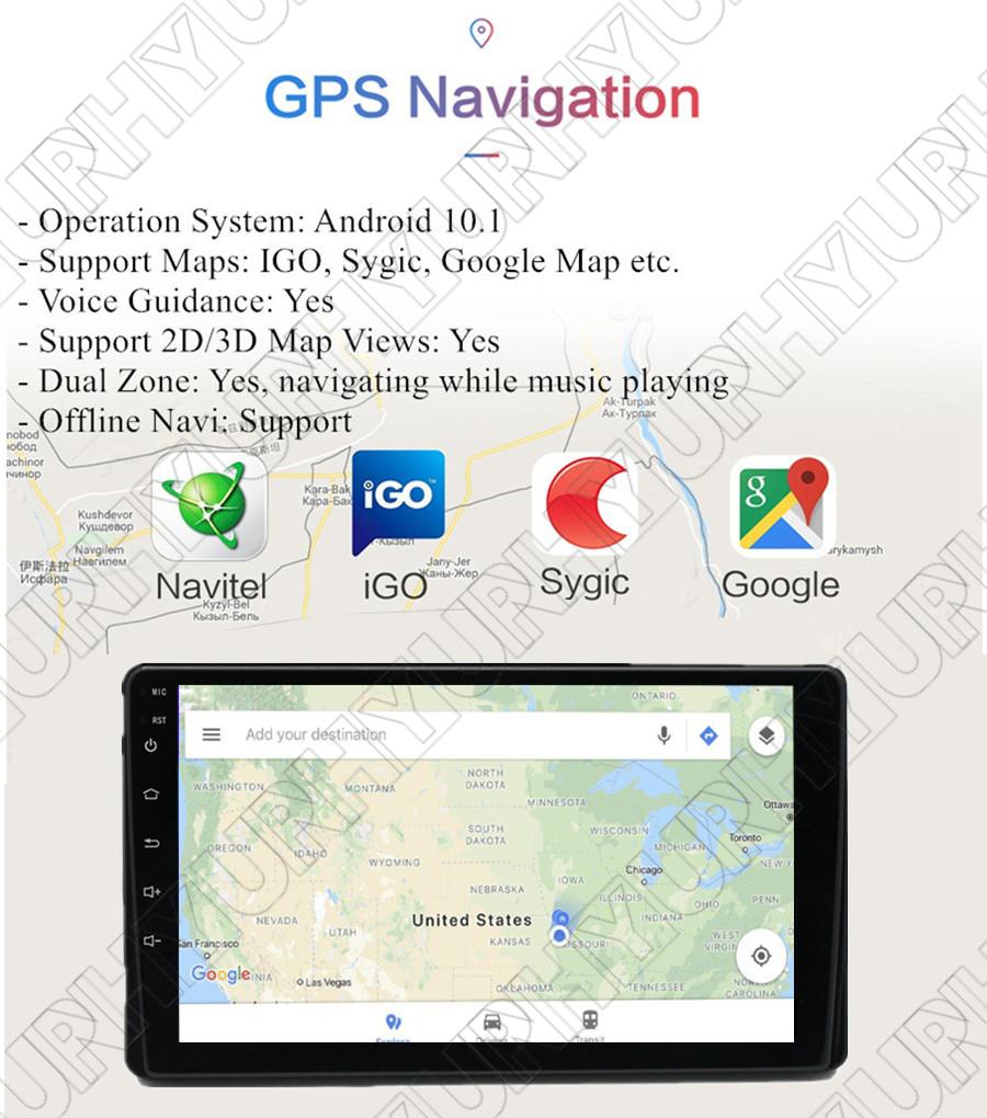 GPS | - Operation System: Android 10.1 - Support Maps: IGO, Sygic, Google Map etc. - Voice Guidance: Yes - Support 2D/3D Map Views: Yes - Dual Zone: Yes, navigating while music playing - Online Navi: Yes, support google maps online navigating |