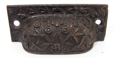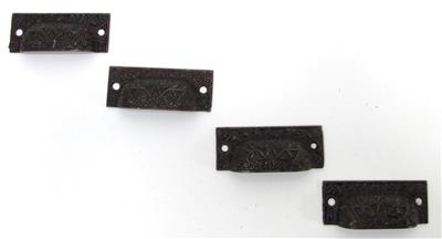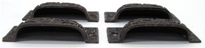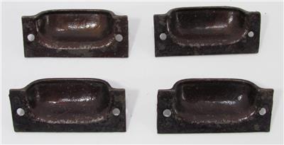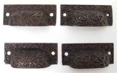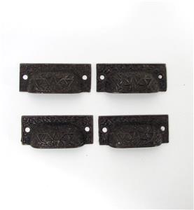 Here is a set of 4 vintage bin pulls. These have no maker's markings. The pulls measure 3 1/8" long and 1 1/4" wide. The mounting holes are 2 5/8" on center. These have an ornate Victorian-style design. I believe these are the Windsor pattern. I do not know the age of these pulls, I assume they are an older reproduction. Get this set of pulls!