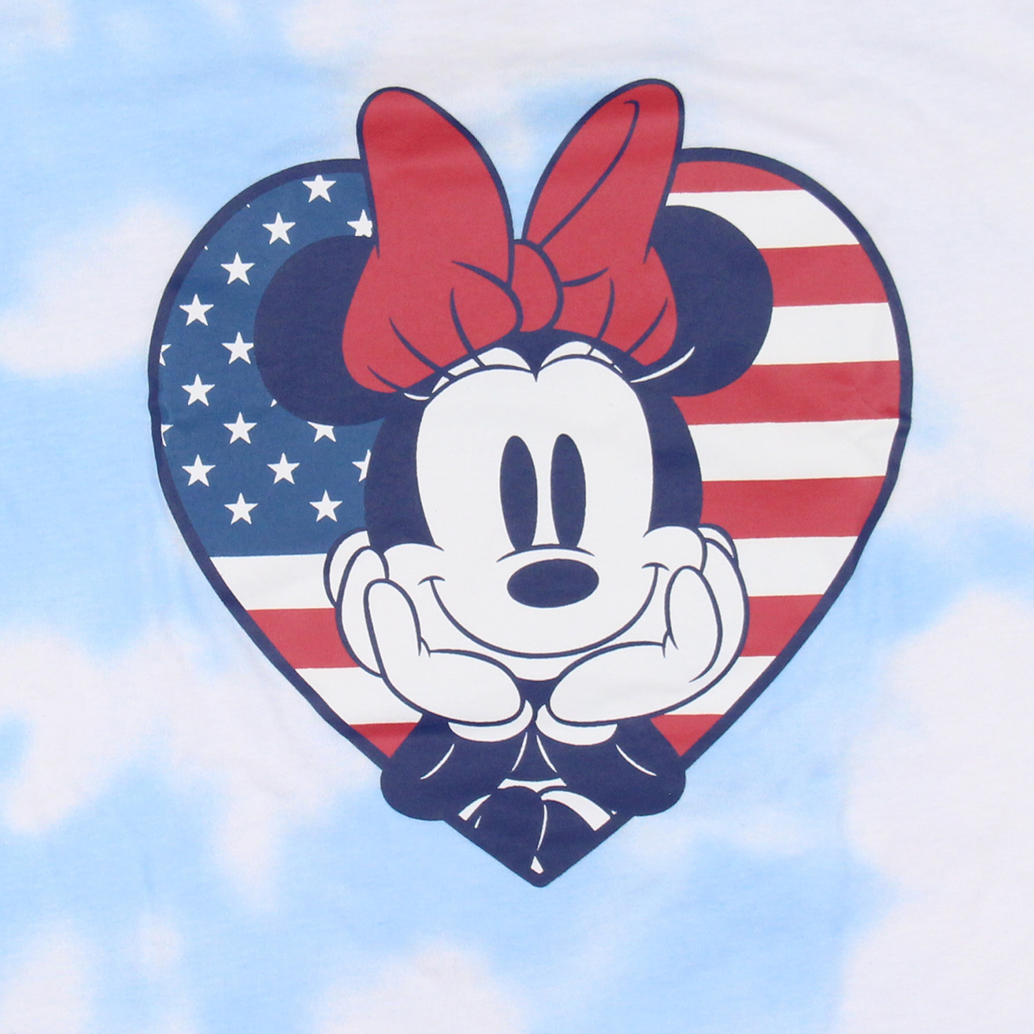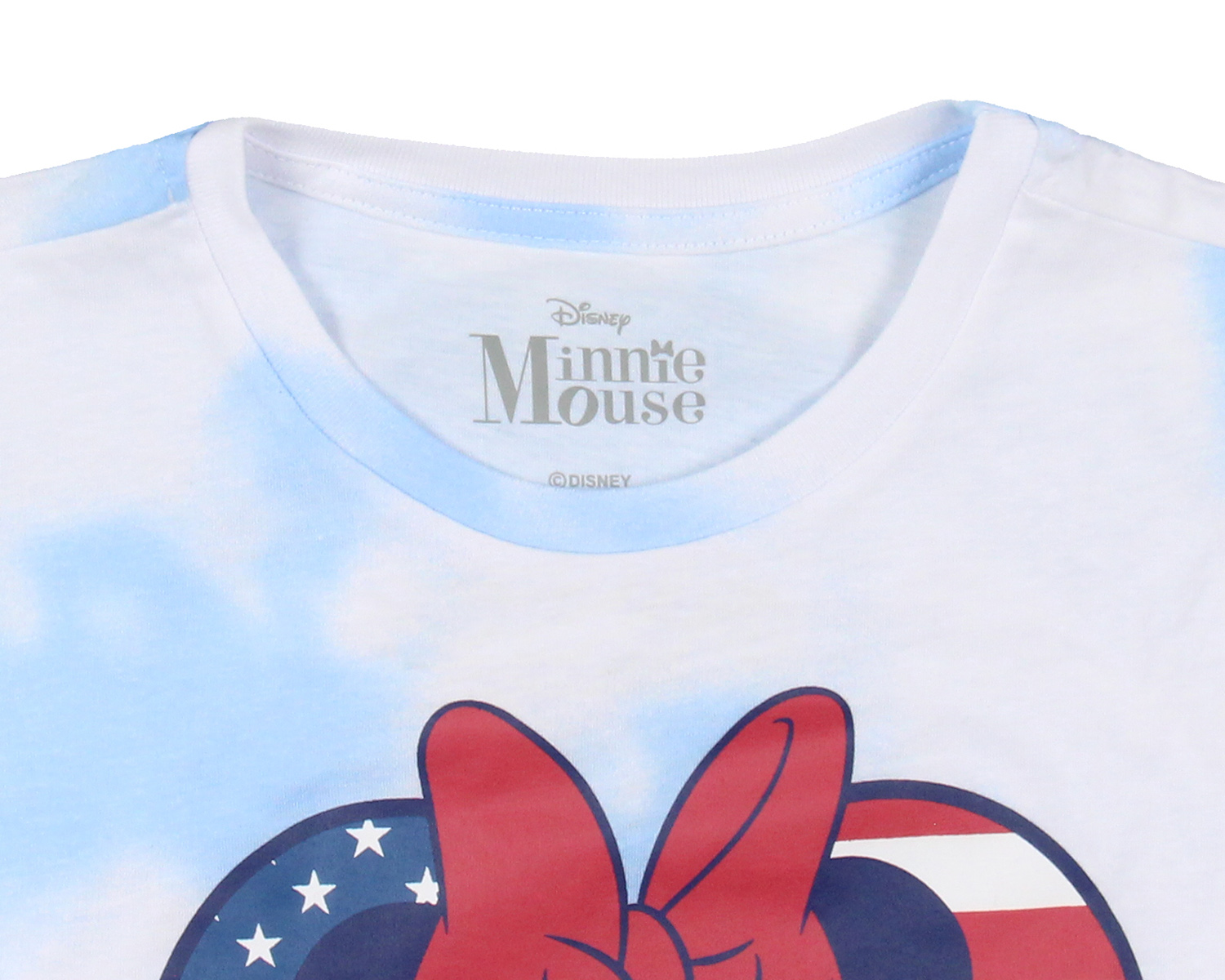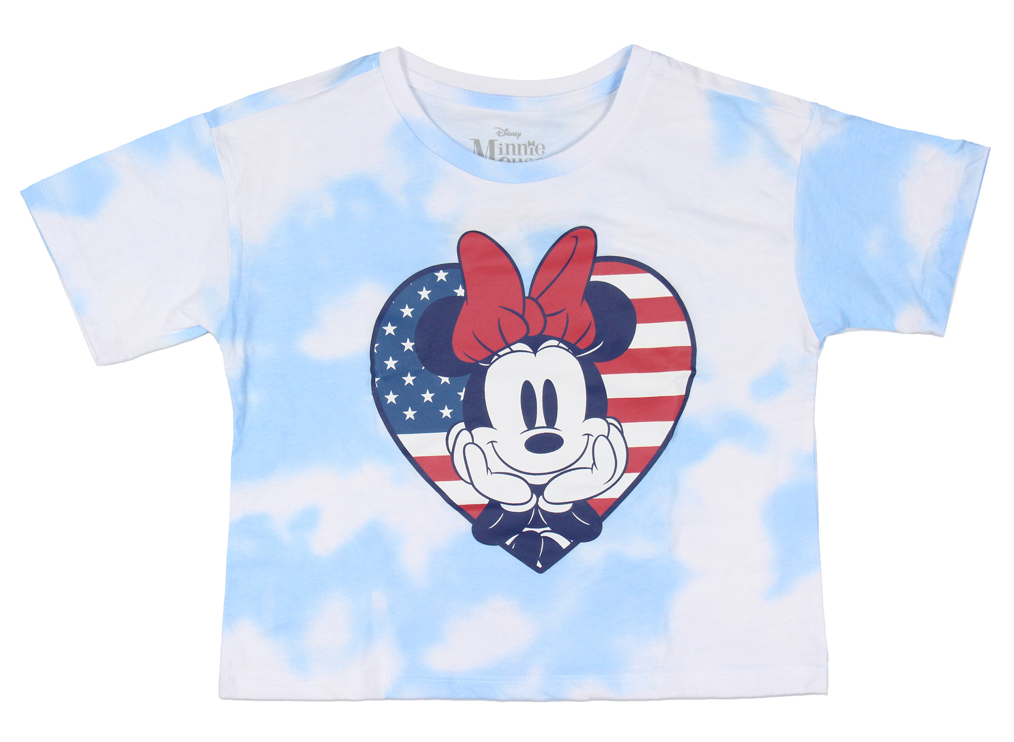 DESIGN: This blue and white cropped tie-dyed t-shirt features Minnie Mouse in a heart-shaped American flag. Show your love for the USA and Minnie Mouse with this adorable American Flag T-Shirt