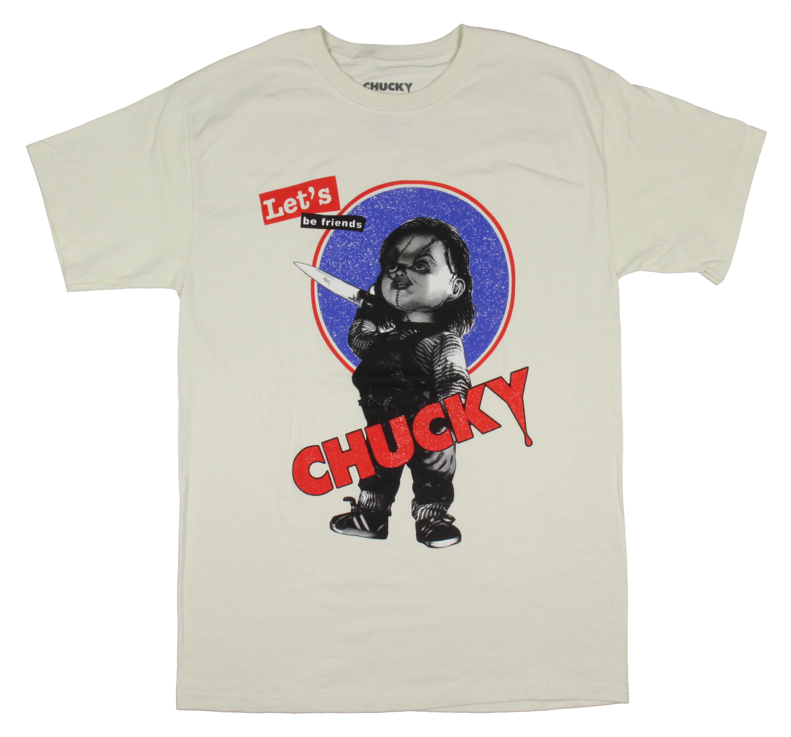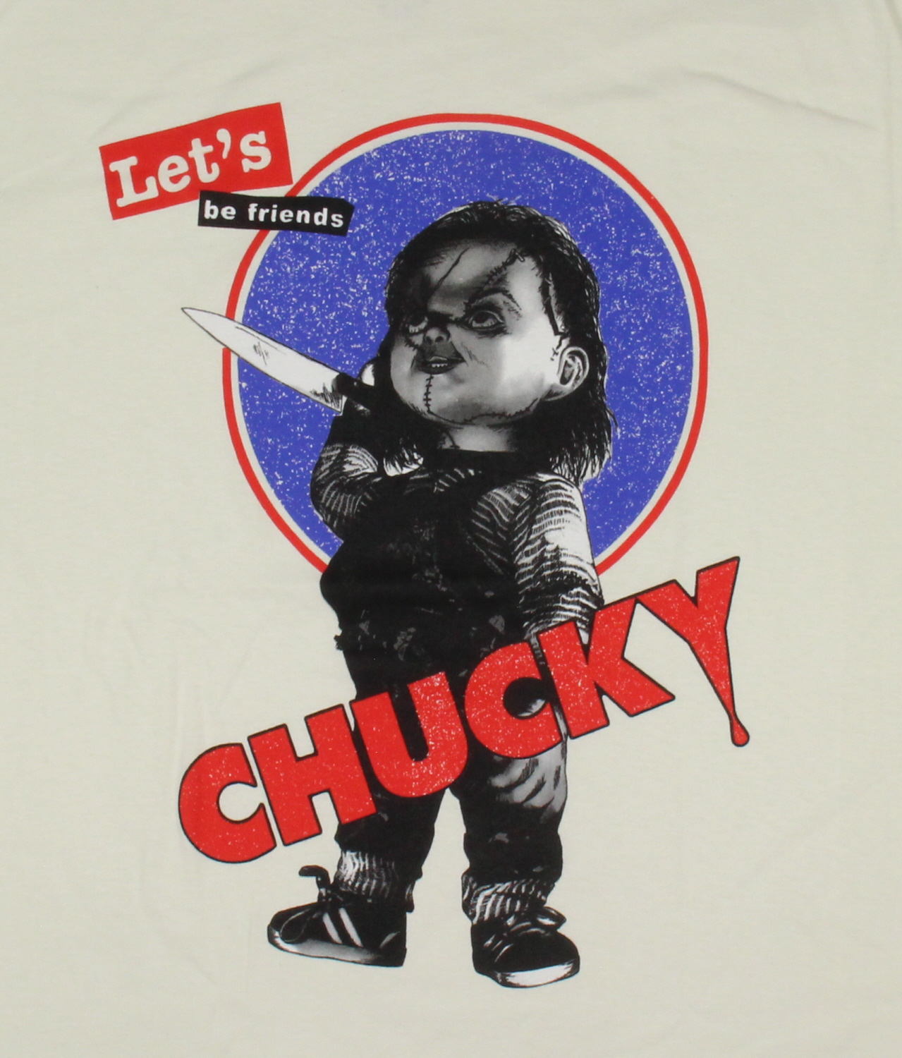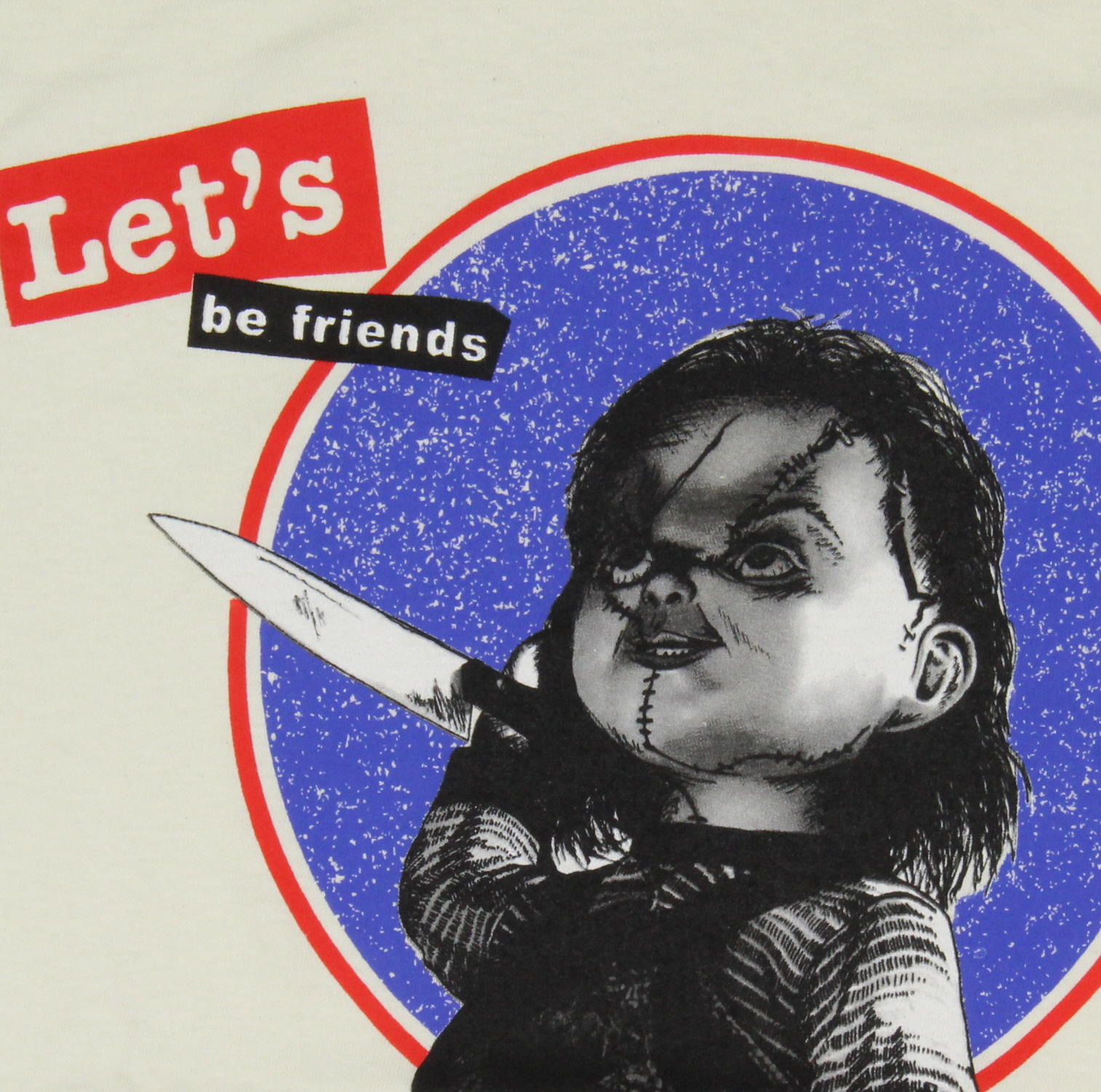 Great Chucky Design -This off-white tee Features the infamous Chucky doll with his chilling invitation, "Let's Be Friends," printed in bold. This shirt brings back nostalgic memories for fans of the Child's Play series