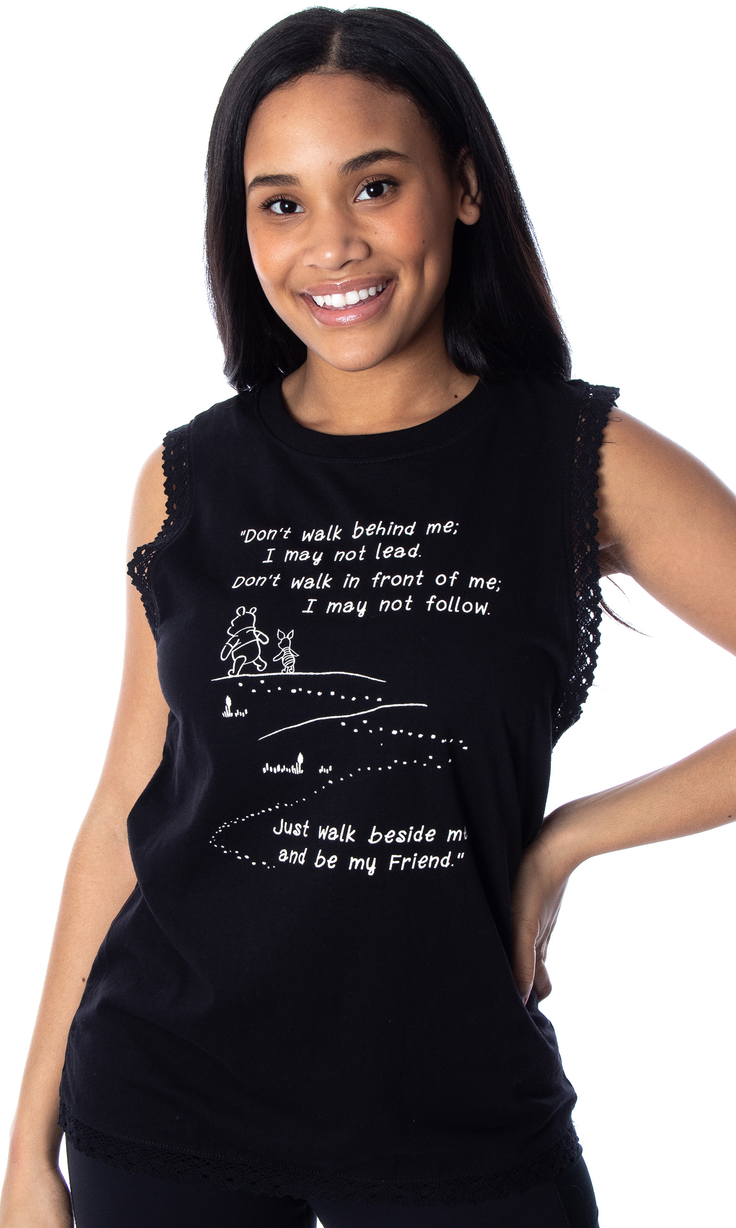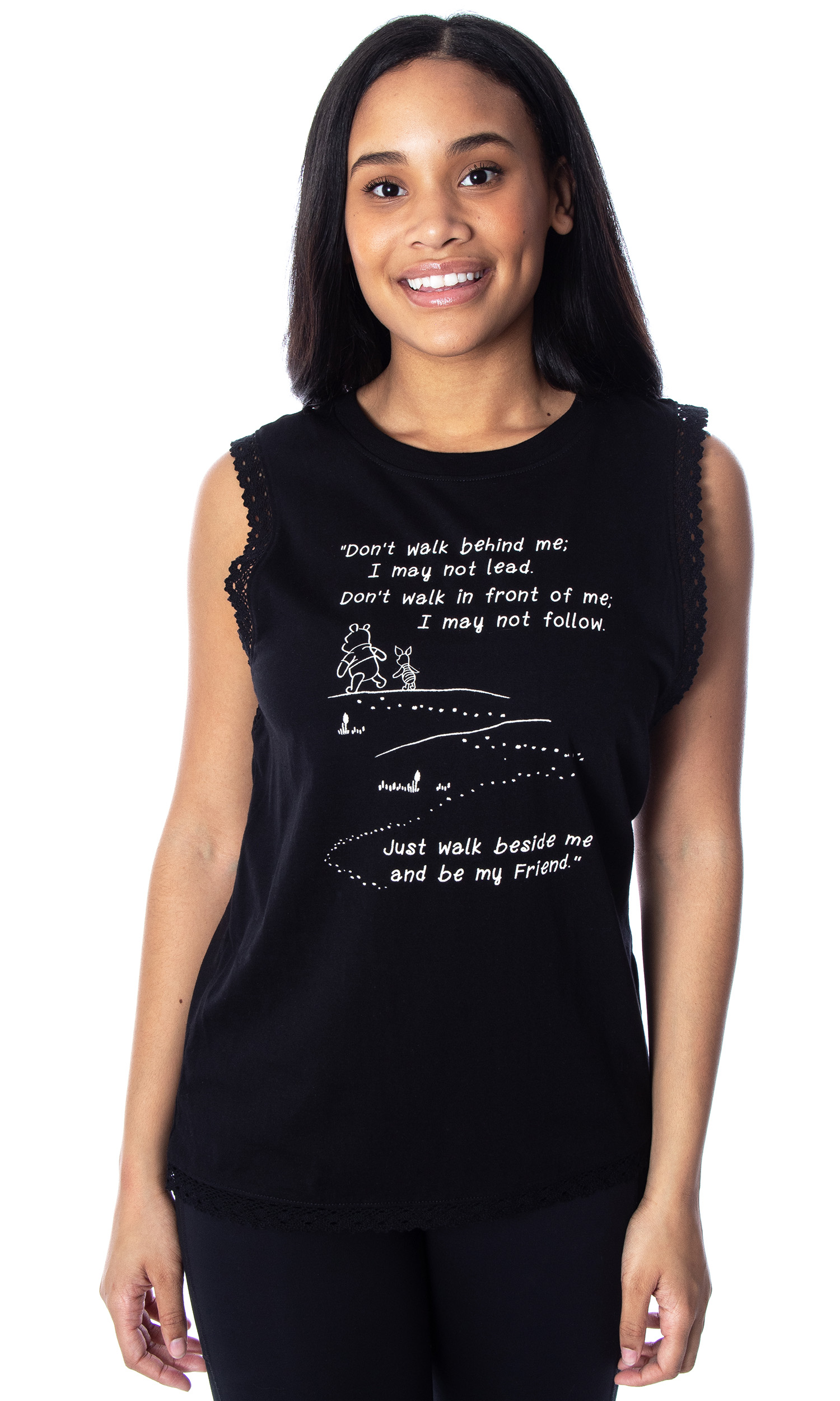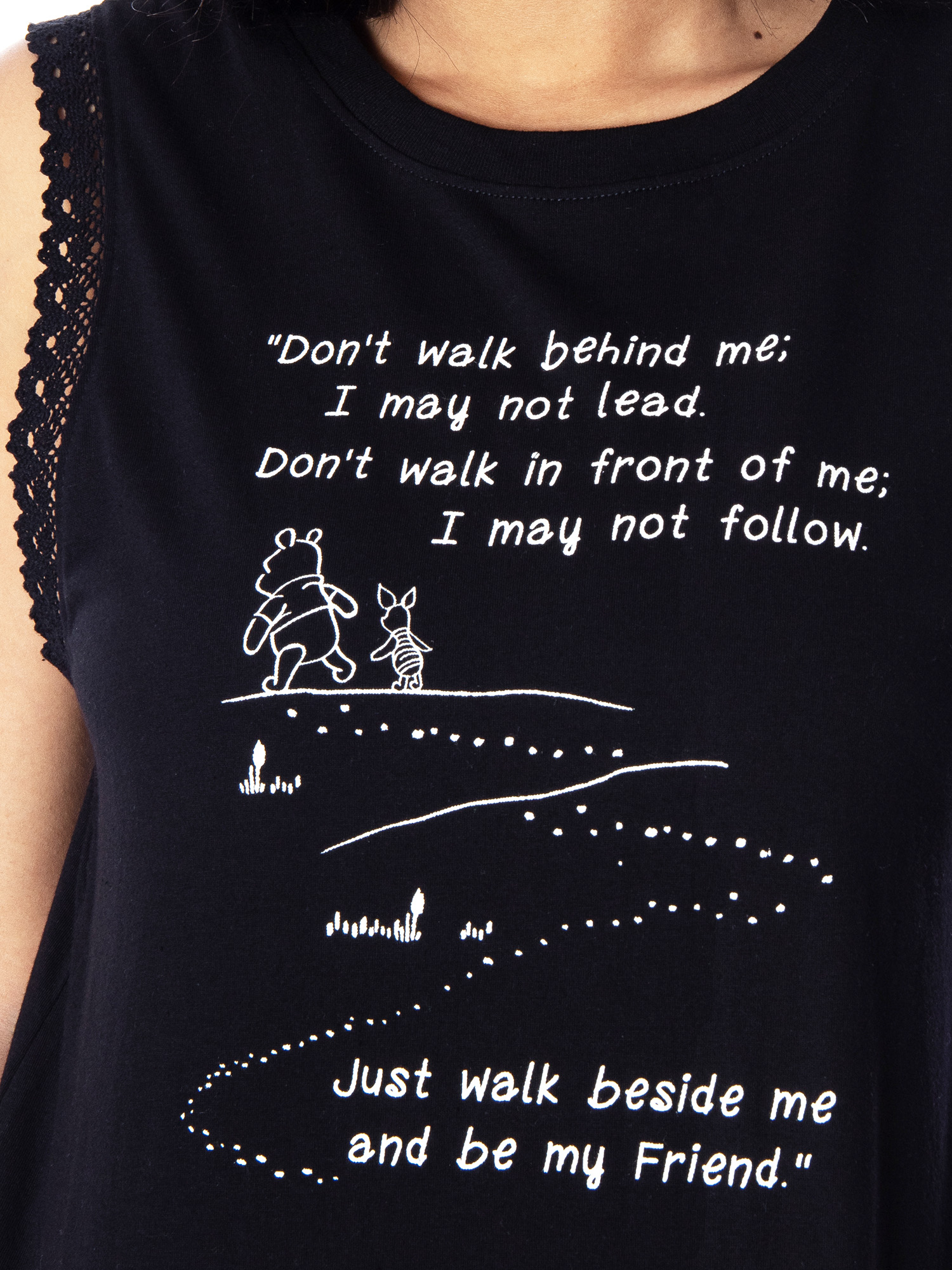 Pooh Bear resides in the Hundred Acre Wood, an imaginative world inhabited by anthropomorphic stuffed toys and animals that Christopher Robin frequents. Pooh is arguably best known for his love of honey (or "Hunny" as he spells it). He keeps a supply of pots at his home, but they are often empty due to his unending appetite. This black muscle shirt features lace accents on the sleeves and hem. The front graphic features Winnie The Pooh and Piglet. The script graphic states "Don't walk behind me; I may not lead. Don't walk in front of me; I may not follow. Just walk beside me and be my friend." Made of 100% Cotton. For added comfort, the shirt is tagless. The care and washing instructions are printed on the inside of the collar.