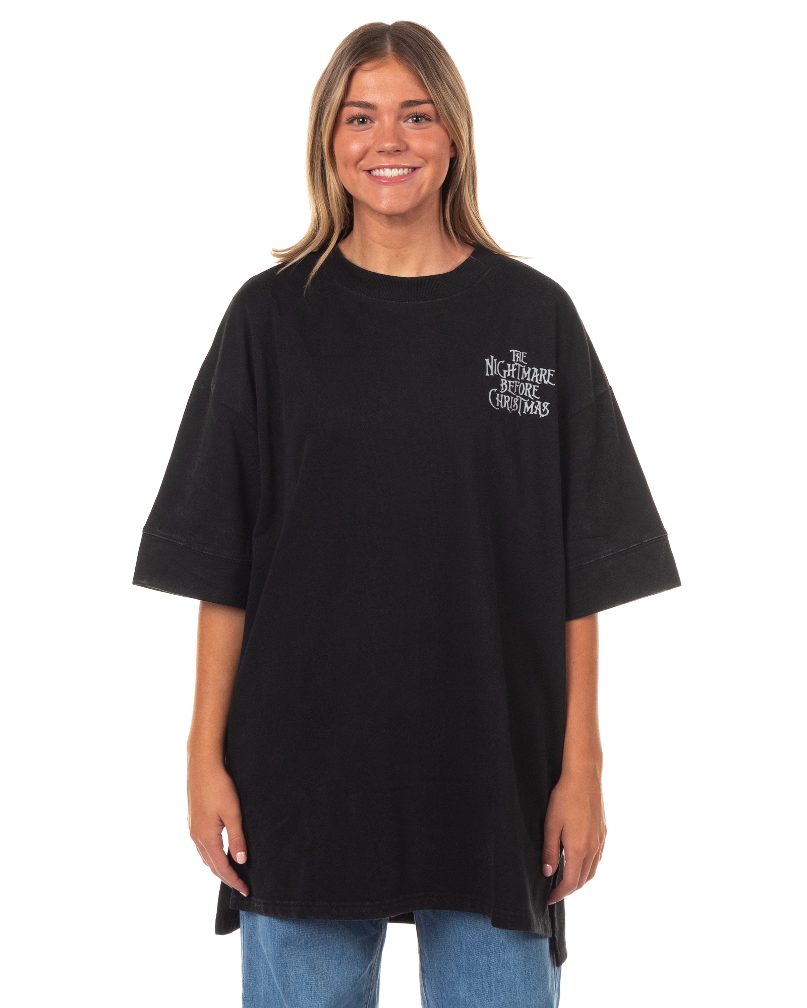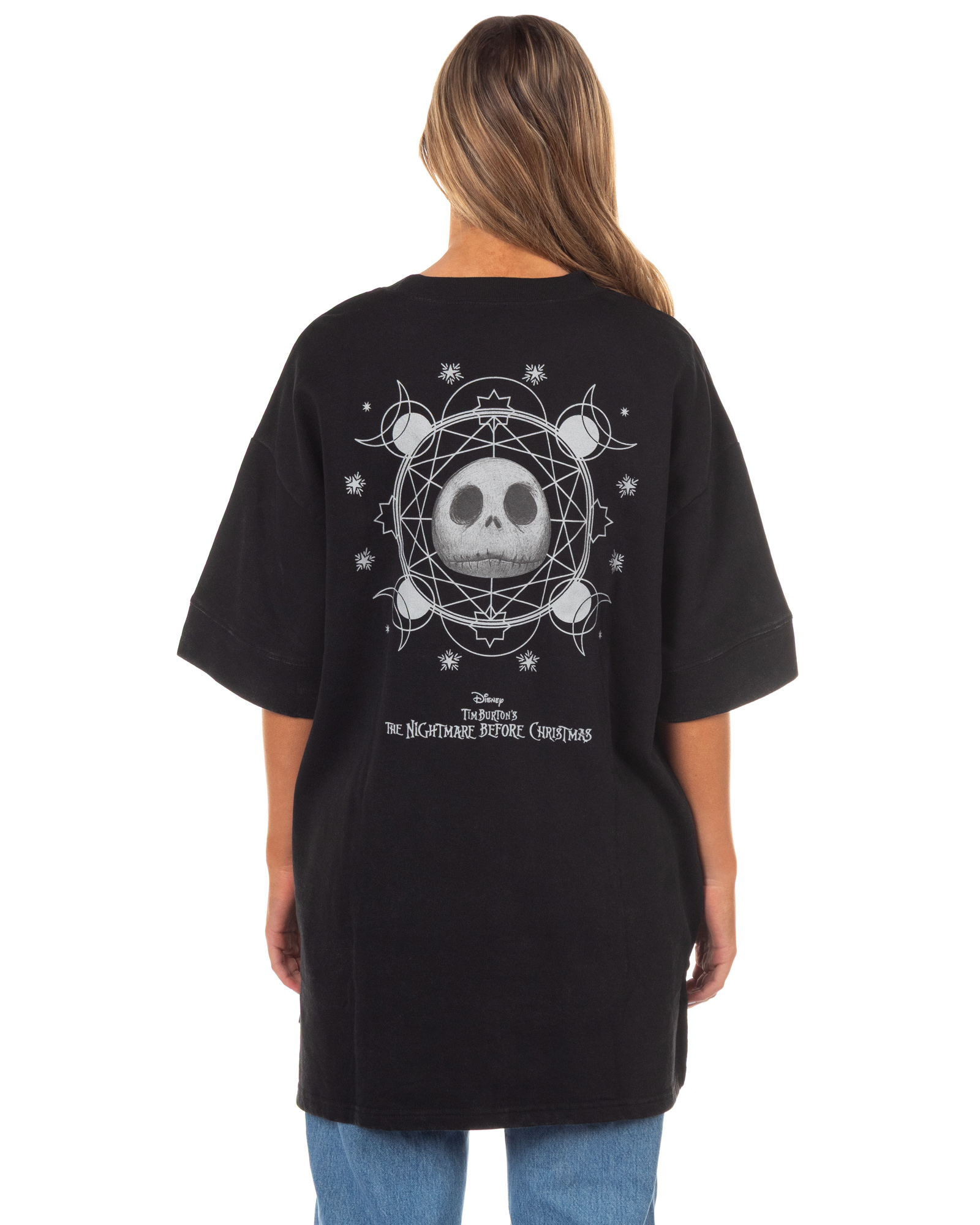 Wrap yourself in the haunting charm of Tim Burton's The Nightmare Before Christmas with this tunic-style pullover sweatshirt. Designed for those who adore a touch of vintage flair, this cozy piece features a distinctive distressed finish along the seams, giving it a well-loved, timeless look. The longer tunic length offers a flattering silhouette with side slits for added comfort and movement. A subtle nod to the film, the small Nightmare Before Christmas logo on the left chest adds a touch of whimsy, while the back showcases a striking design of Jack Skellington against a backdrop of stars and a crescent moon, making this sweatshirt a must-have for any fan of the beloved classic.