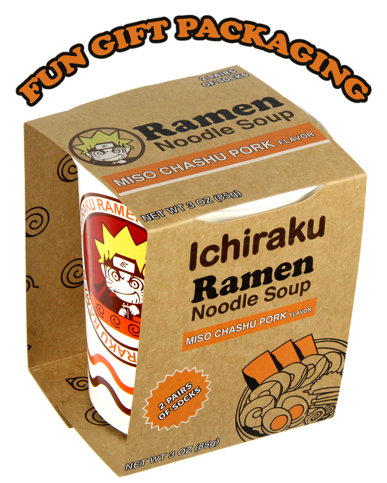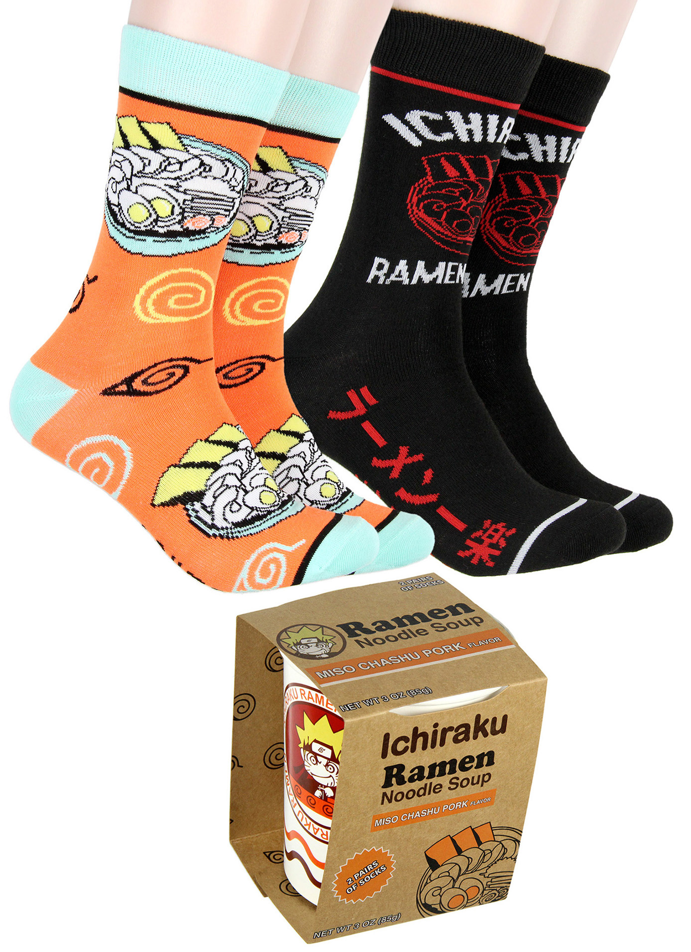 ONE-OF-A-KIND ICHIRAKU RAMEN NOODLE CUP GIFT BOX DESIGN - The 2-pack of crew socks come rolled up complete in a gift container that looks just like an instant ramen noodle cup that has Naruto and Ichiraku Ramen script.
