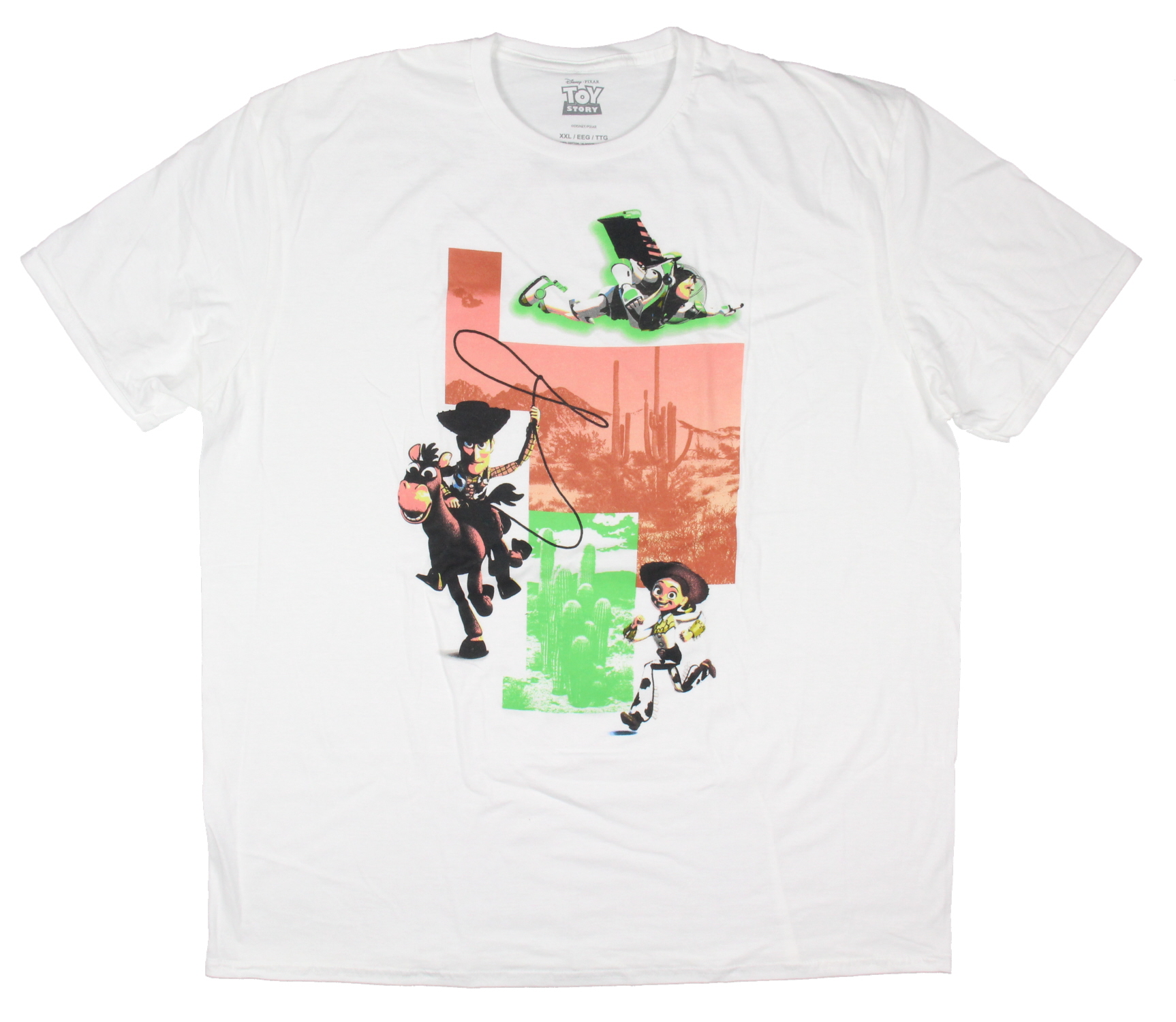 STAND OUT IN STYLE with this eye-catching Buzz Lightyear, Woody, Bullseye and Jesse tee. Flying, riding and running against a block desert backdrop. Show off your love for Toy Story with style and flair