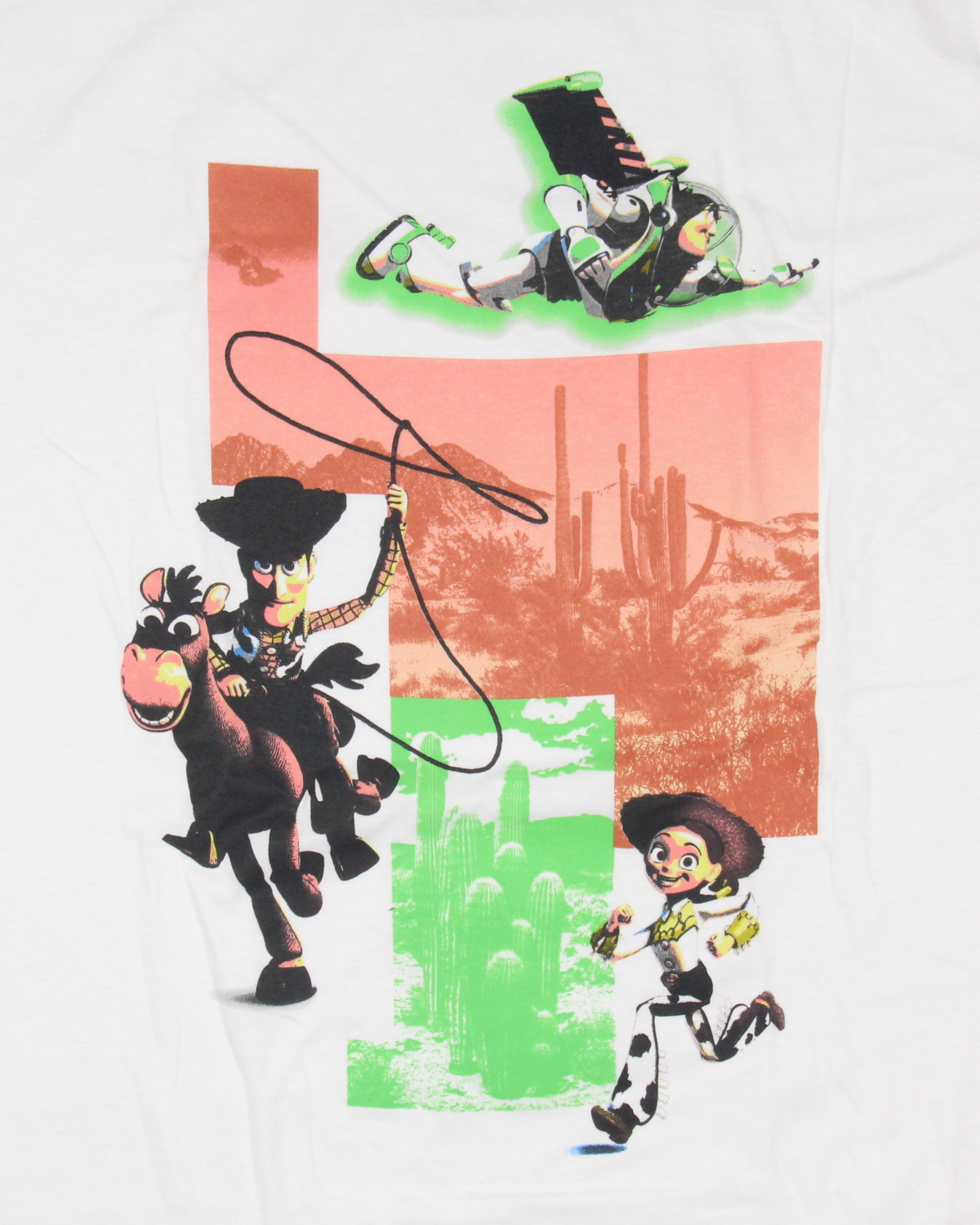 The front of the shirt showcases Buzz Lightyear flying, Woody riding Bullseye with a lasso, and Jesse running against a desert block backdrop. All are ready for another adventure. The interesting colors and detailed artwork bring these characters to life, making it a standout piece for any Disney enthusiast.