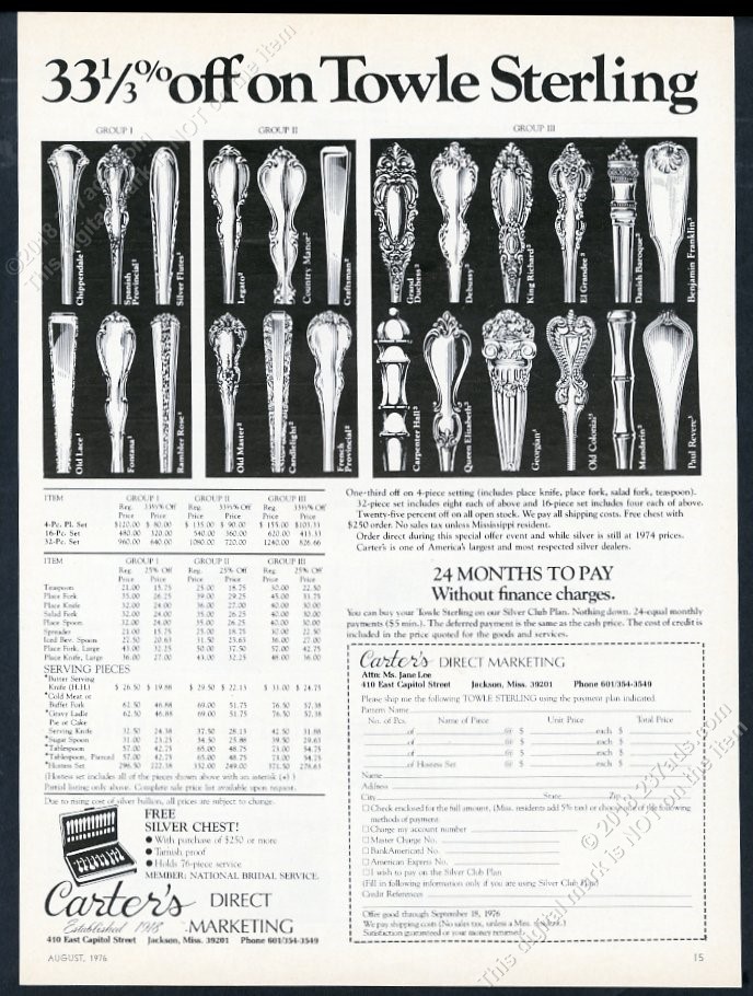 This is an original 1976 print ad for Towle sterling from Carter's Direct Marketing! It measures approximately 12.25" x 9.25" overall, has no tears or stains, comes from a dry, high-altitude, smoke-free environment, and is strictly graded "Fine". This vintage ad is not any kind of later reproduction, photocopy or reprint (most ads were published at one time only, and never commercially reproduced). An unusual and distinctive piece for your frame. THANK YOU for the opportunity to earn your business. Thank you for helping us celebrate our 19TH YEAR on ebay! Watch for our special 19% off sales through the year.
